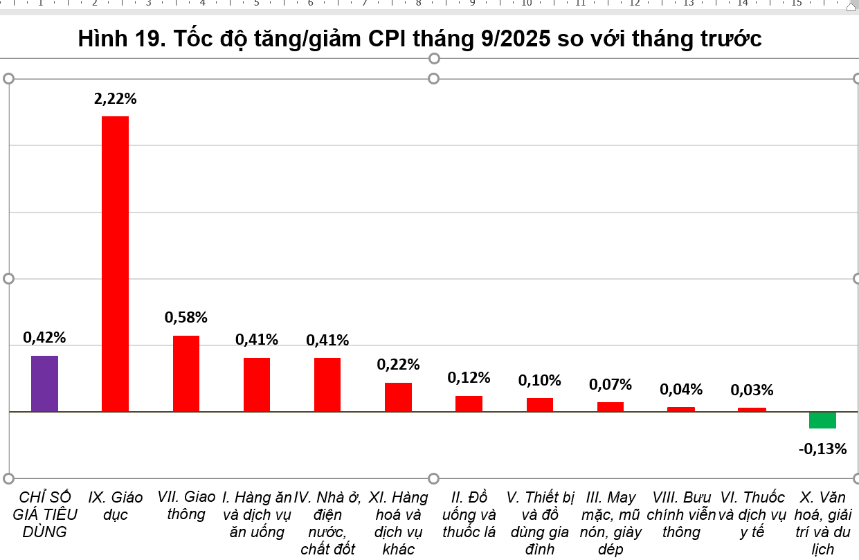 Trong mức tăng 0,42% của CPI tháng 9 so với tháng trước, có 10 nhóm hàng hóa và dịch vụ có chỉ số giá tăng, riêng chỉ số giá nhóm văn hóa, giải trí và du lịch giảm.