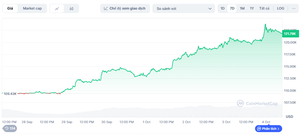 Đồng tiền số lớn nhất theo giá trị vốn hóa đã ghi nhận chuỗi tăng 8 ngày liên tiếp, có thời điểm tăng thêm 2% lên 123.261 USD. Bitcoin từng lập đỉnh 124.514 USD vào ngày 14/8 và hiện đã tăng hơn 30% từ đầu năm.
