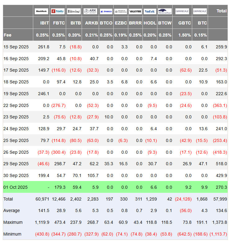 Dòng tiền ETF BTC từ 15.9 đến 1.10 (đơn vị triệu USD) - Ảnh: Farside Investors