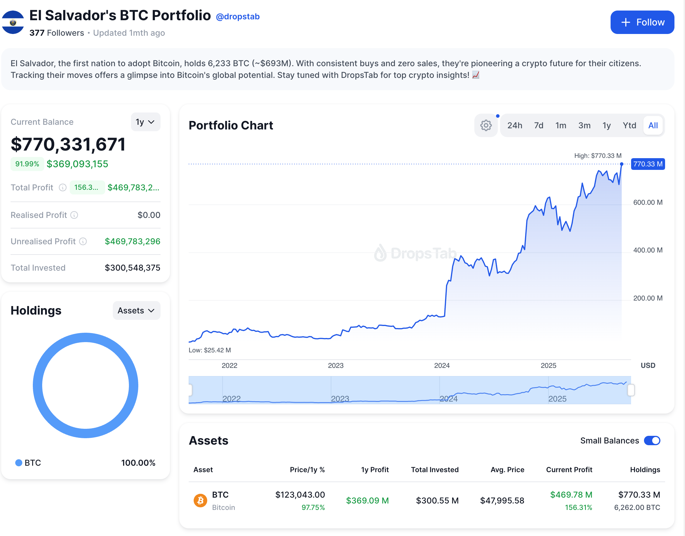 Theo báo cáo của DropStab, El Salvador đang nắm giữ 6.262 Bitcoin trong kho lưu trữ tài sản số. Tổng thống quốc gia Nam Mỹ này chỉ mua BTC kể từ 2021. Giá trị của chúng hiện tại vào khoảng 770 triệu USD, khi đồng tiền số giao dịch quanh mốc 122.000 USD vào sáng 5/10, thời điểm ông Bukele đăng bài.