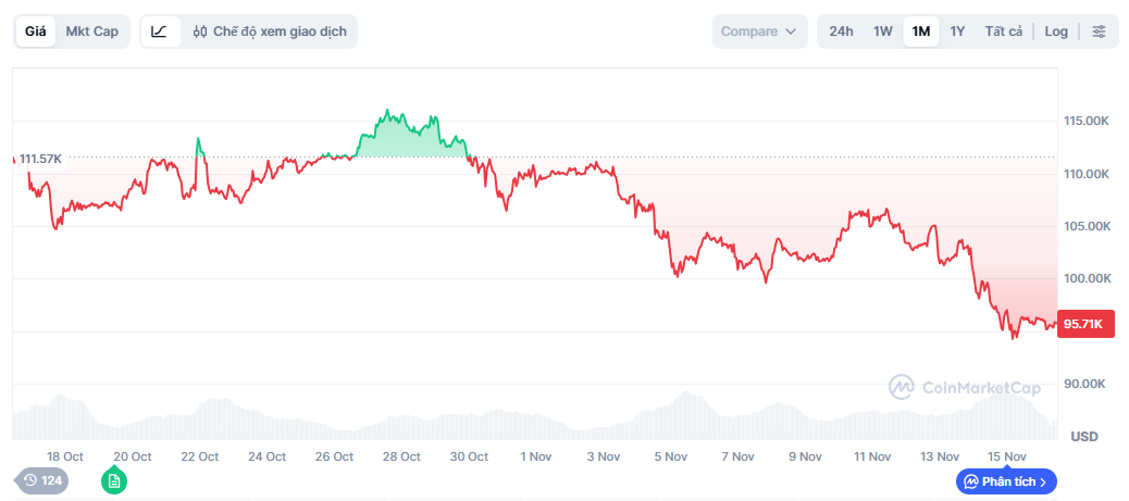 Theo CoinDesk, giá Bitcoin đã rơi xuống mốc 95.000 USD, đánh dấu tuần “giông bão” kéo giá đồng tiền số này xuống mức thấp nhất kể từ tháng 5.