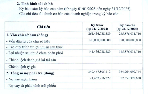 Vốn chủ sở hữu của doanh nghiệp cũng đạt gần 266 tỷ đồng, lợi nhuận sau thuế chưa phân phối là 146 tỷ đồng.