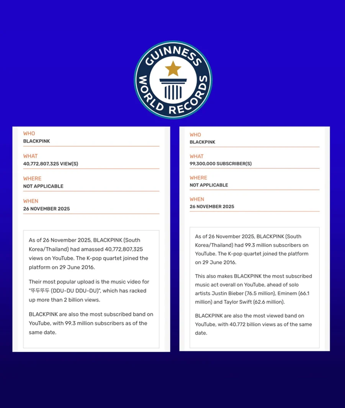 Theo cập nhật mới nhất từ Guinness World Records, kênh YouTube chính thức của BLACKPINK đã chạm mốc 99,3 triệu người đăng ký, đồng thời vượt 40,7 tỷ lượt xem. Với thành tích này, nhóm được chứng nhận là “Nhóm nhạc có nhiều người đăng ký nhất” và “Nhóm nhạc có nhiều lượt xem nhất” trên YouTube toàn cầu. Đây không chỉ là những con số ấn tượng, mà còn là minh chứng cho sức ảnh hưởng bền bỉ và vị thế hàng đầu của bốn cô gái nhà YG trên bản đồ âm nhạc số.
