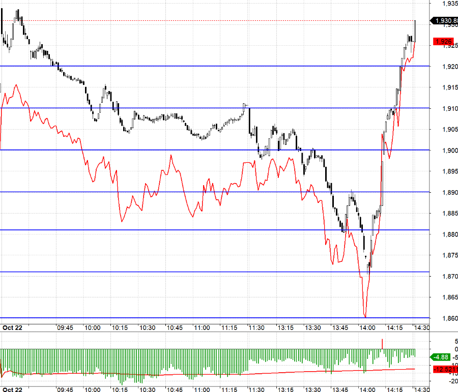Thị trường phái sinh hôm nay đã “dự kiến” sớm về diễn biến điều chỉnh. Dù đầu ngày VN30 tăng tốt nhưng F1 chiết khấu rất sâu. Cả buổi sáng basis trung bình tới âm 16 điểm, không thể Short được trong khi Long cũng không có cơ sở. Phải đến đầu giờ chiều basis mới hẹp hơn khi VN30 có 20 phút neo trên 1900.xx. Độ rộng lúc này đã khá kém nhưng các trụ lại giằng co lẫn nhau. Để thúc đẩy biên độ giảm thì cần phải có trụ. VIC, VHM, CTG là then chốt. VN30 có nhịp lao dốc ngon lành nhất và chạm chuẩn 1870.xx thì dừng lạ. F1 giảm trước, basis chiết khấu xuống tận 1860.xx, thời cơ tốt để cover.