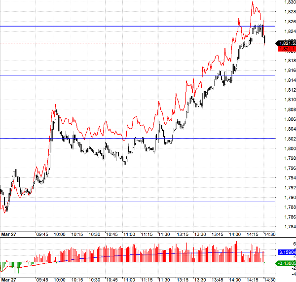 Thị trường phái sinh hôm nay tích cực, F1 có trạng thái basis đảo ngược từ rất sớm. Ngày cả nhịp lùi từ 10h-11h của VN30 thì basis vẫn dương, thậm chí còn mở rộng. Đây là một tín hiệu đặt cược mạnh mẽ trong tình huống giá dầu tăng và chứng khoán thế giới đỏ. Trừ nhịp lùi giữa buổi sáng khiến Short bất lợi, còn lại VN30 hình thành xu hướng lên rõ ràng, biên độ rộng từ 1789.xx tới 1825.xx và không có nhịp đảo hướng biên độ lớn nào.