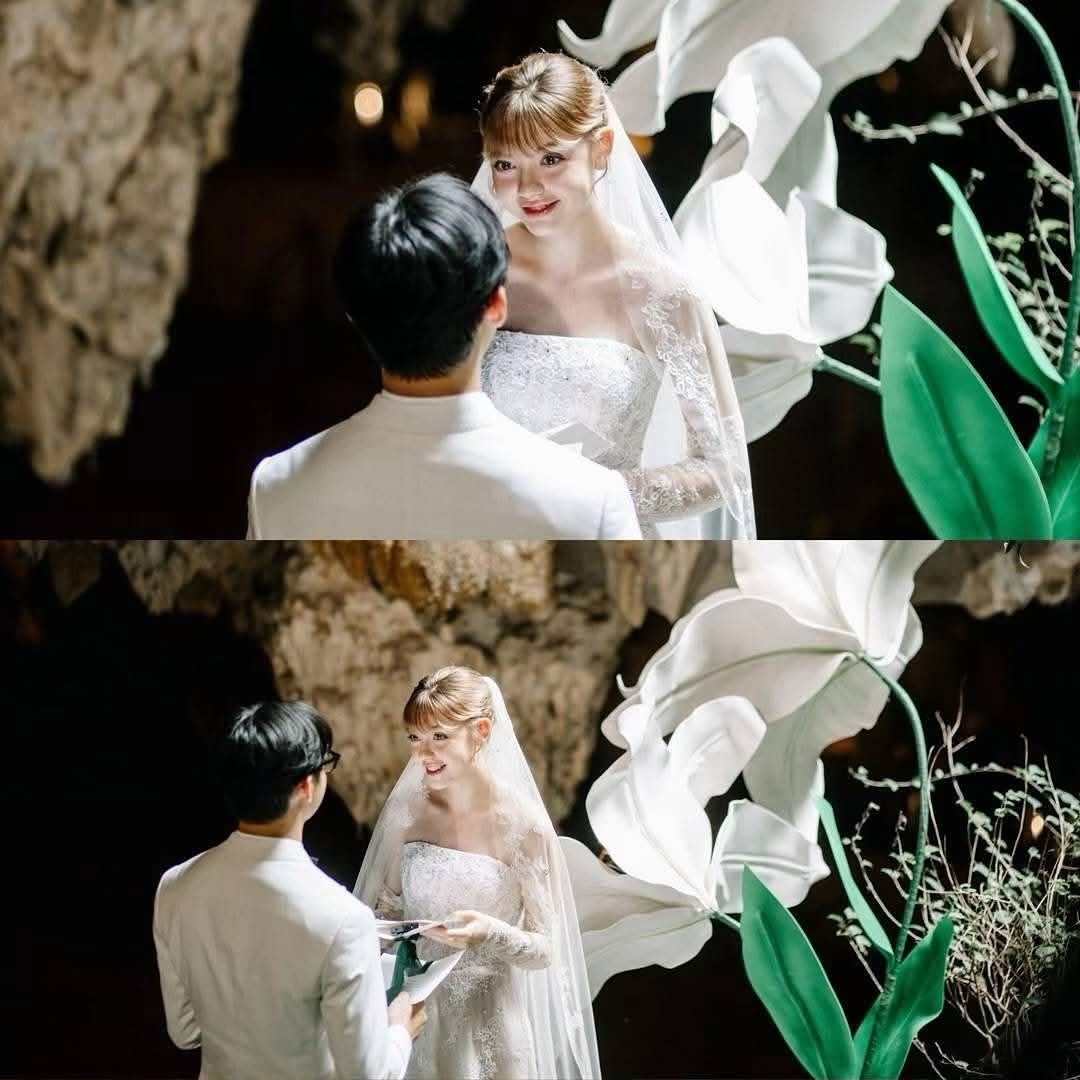 Ánh sáng tự nhiên từ cửa hang rọi xuống hay luồng sáng ấm áp từ đèn chiếu tạo nên hiệu ứng lung linh, huyền ảo, làm nổi bật khoảnh khắc trao lời thề nguyện của cô dâu, chú rể. (Ảnh: Niên và Katia)