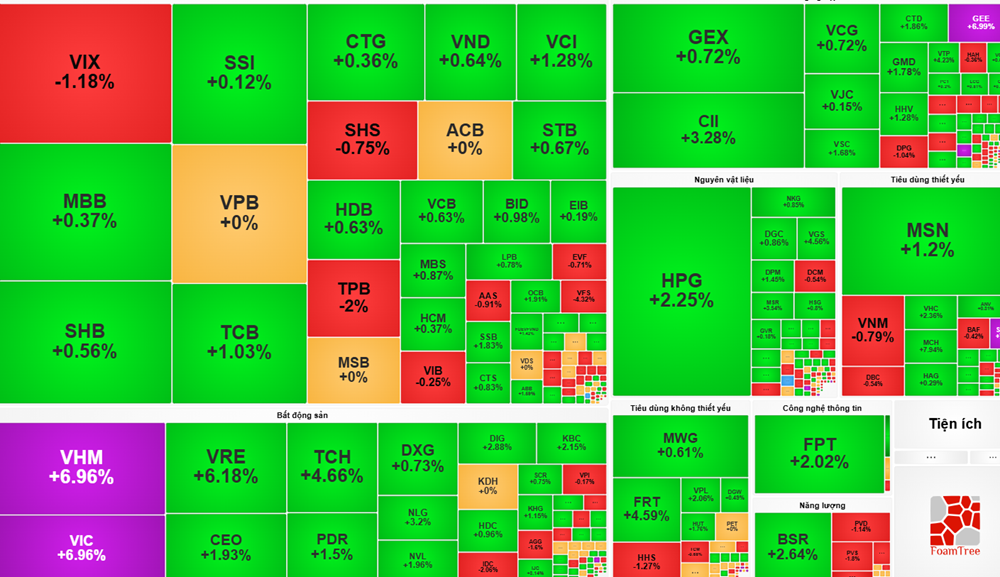 Cổ phiếu vốn hóa lớn đóng vai trò giữ nhịp, tiêu biểu như VHM, VIC, FPT, HPG, MSN – nhóm chiếm tới hơn 60% mức tăng điểm của VN-Index trong phiên.