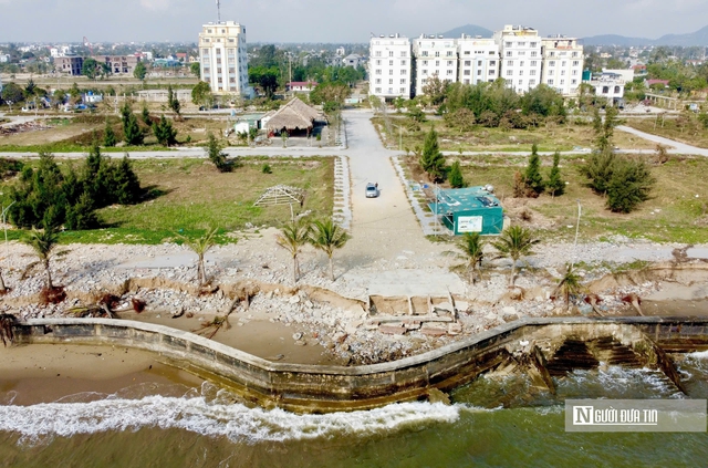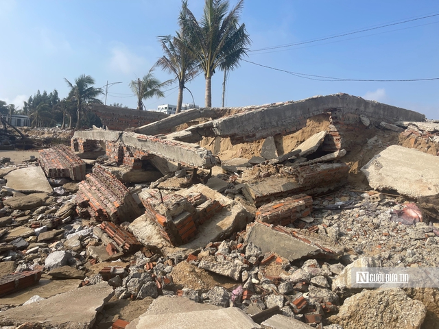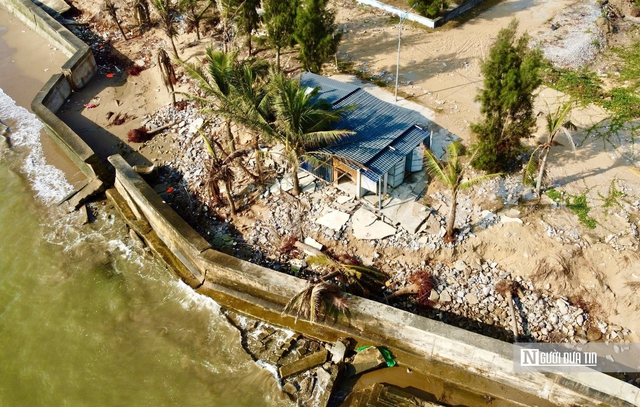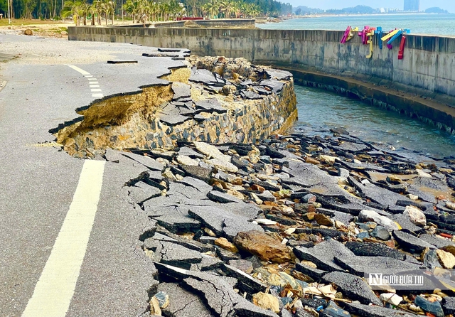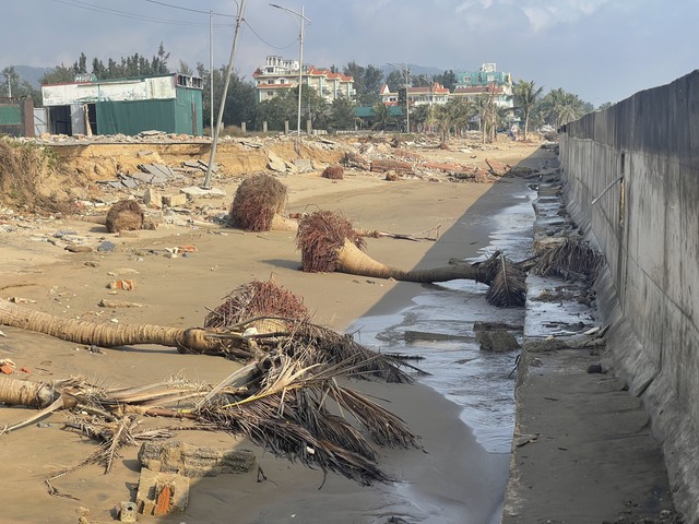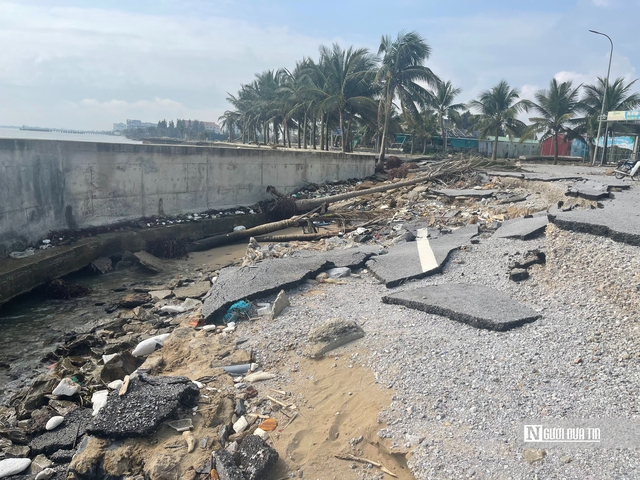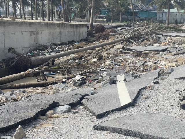 Theo quan sát của PV, hàng trăm mét bờ kè bằng bê tông bị sóng đánh vỡ nát; đường ven biển bị sụt lún, nhiều đoạn đường bị khoét sâu cả mét, mặt đường nứt toác không thể đi lại; hàng loạt cây dừa đổ gãy vẫn nằm ngổn ngang. Hàng dừa chạy dọc theo bờ biển, từng là nơi chụp ảnh của du khách giờ bật gốc, xiêu vẹo.