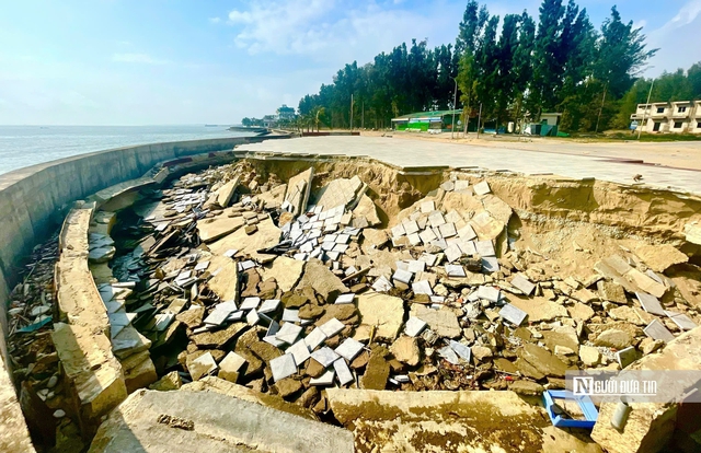 Đường bờ biển bị sụt lún nghiêm trọng gây nguy hiểm cho người và phương tiện giao thông khi đi qua.