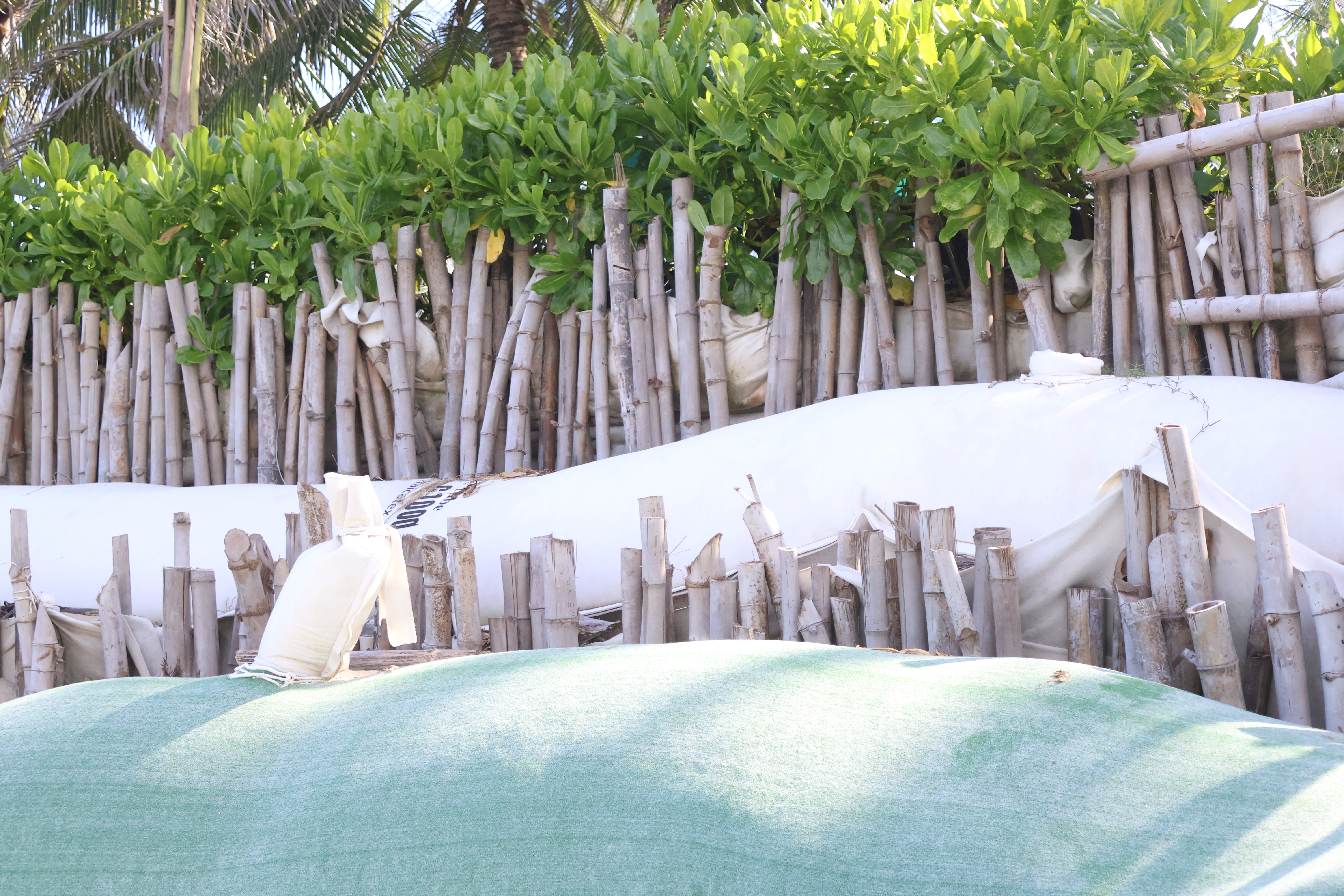 Để giữ bãi biển, người dân và chính quyền địa phương đã triển khai nhiều giải pháp ứng cứu tạm thời bằng cọc tre, bao cát, thảm xơ dừa. Tuy nhiên, các công trình kè tạm không đem lại hiệu quả, thậm chí còn hư hỏng nặng do sóng lớn và gió mạnh.