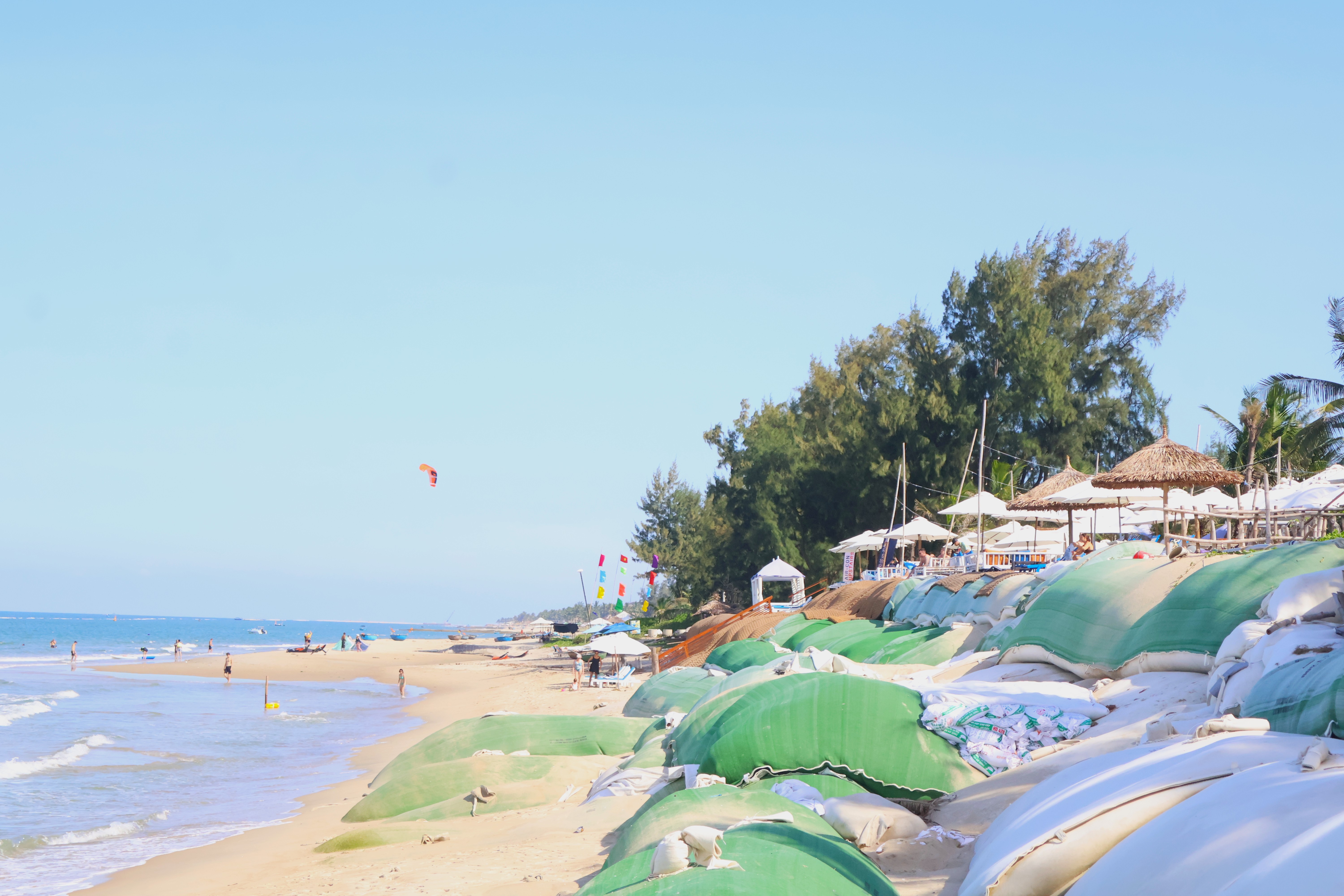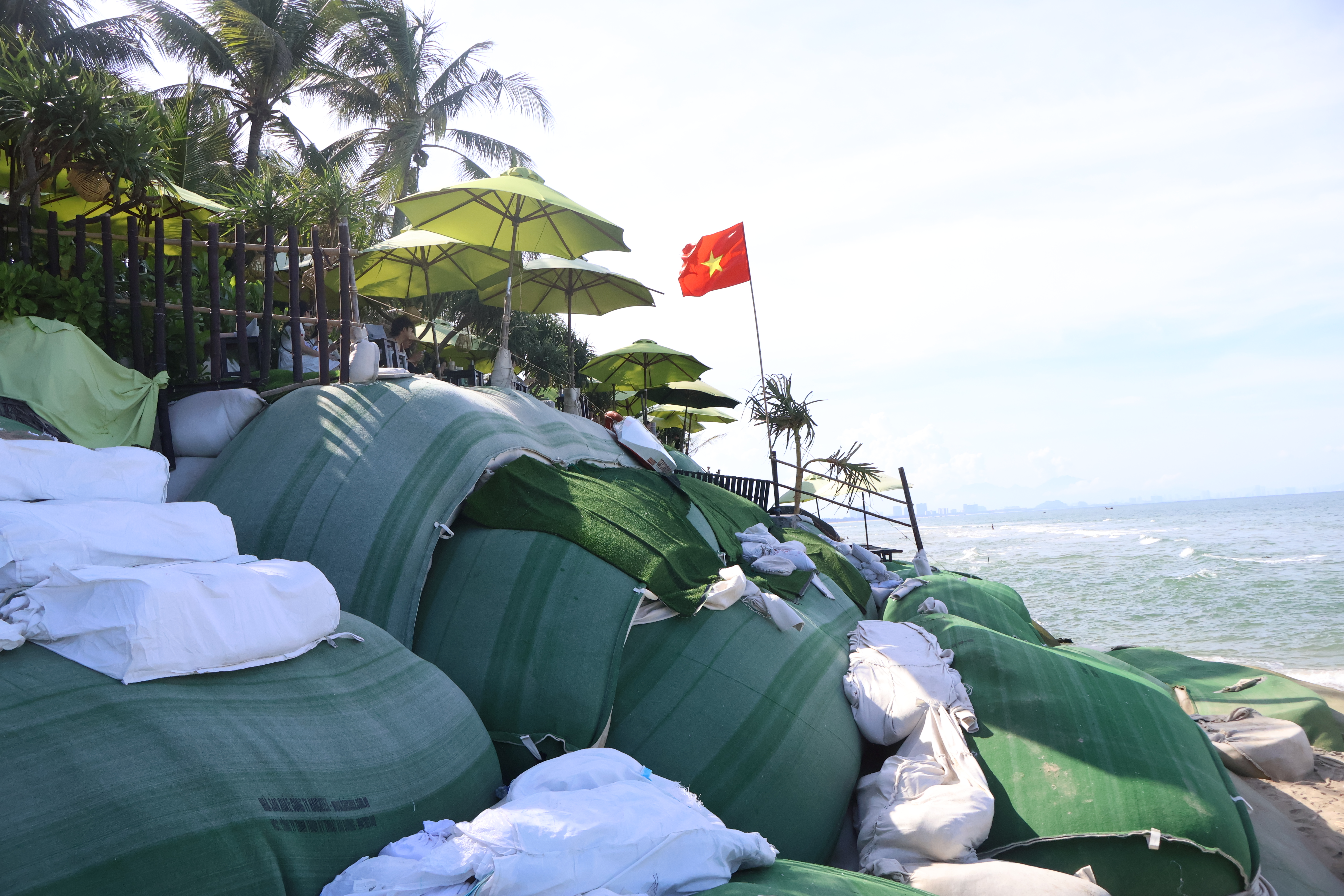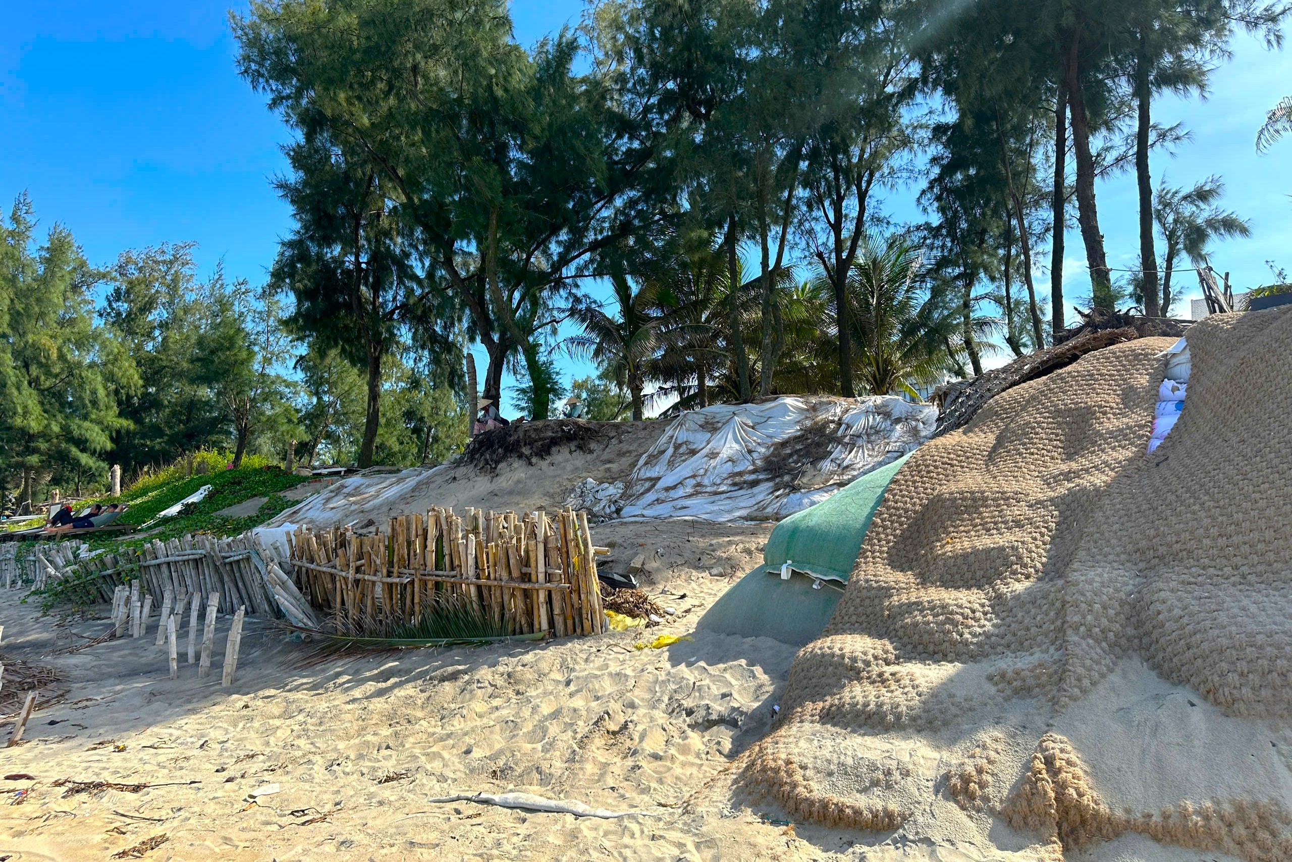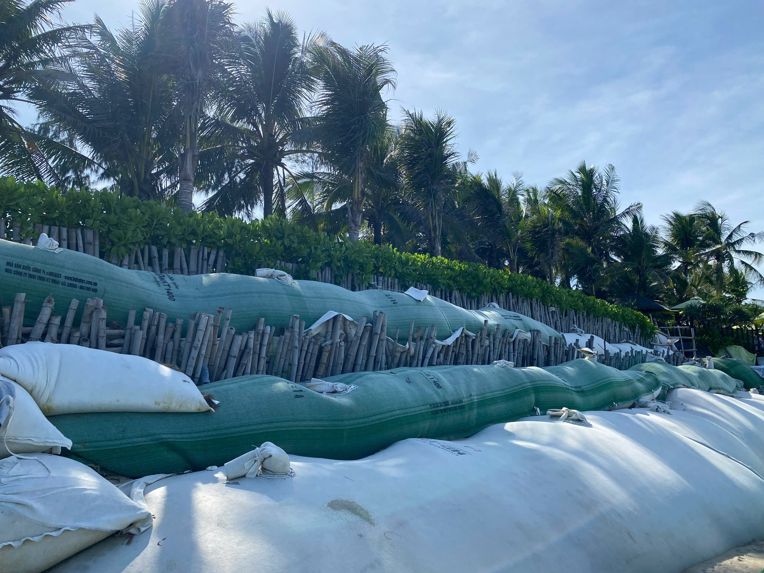 Để giữ bãi biển, người dân đã gia cố tạm thời bằng những bao cát nặng hàng chục tấn