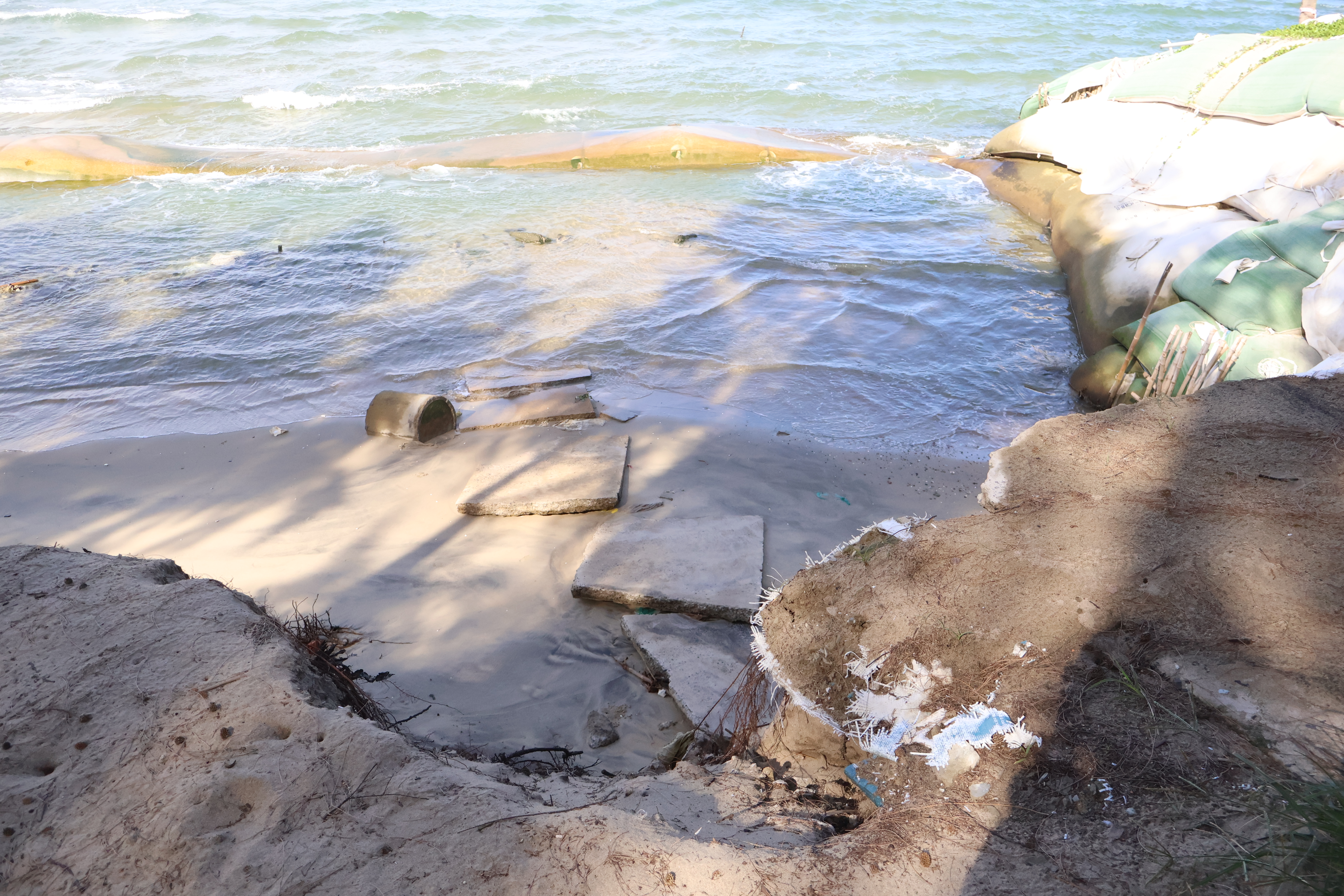 Sóng lớn nhấn chìm nhiều bao cát, ngoạm sâu vào đất liền