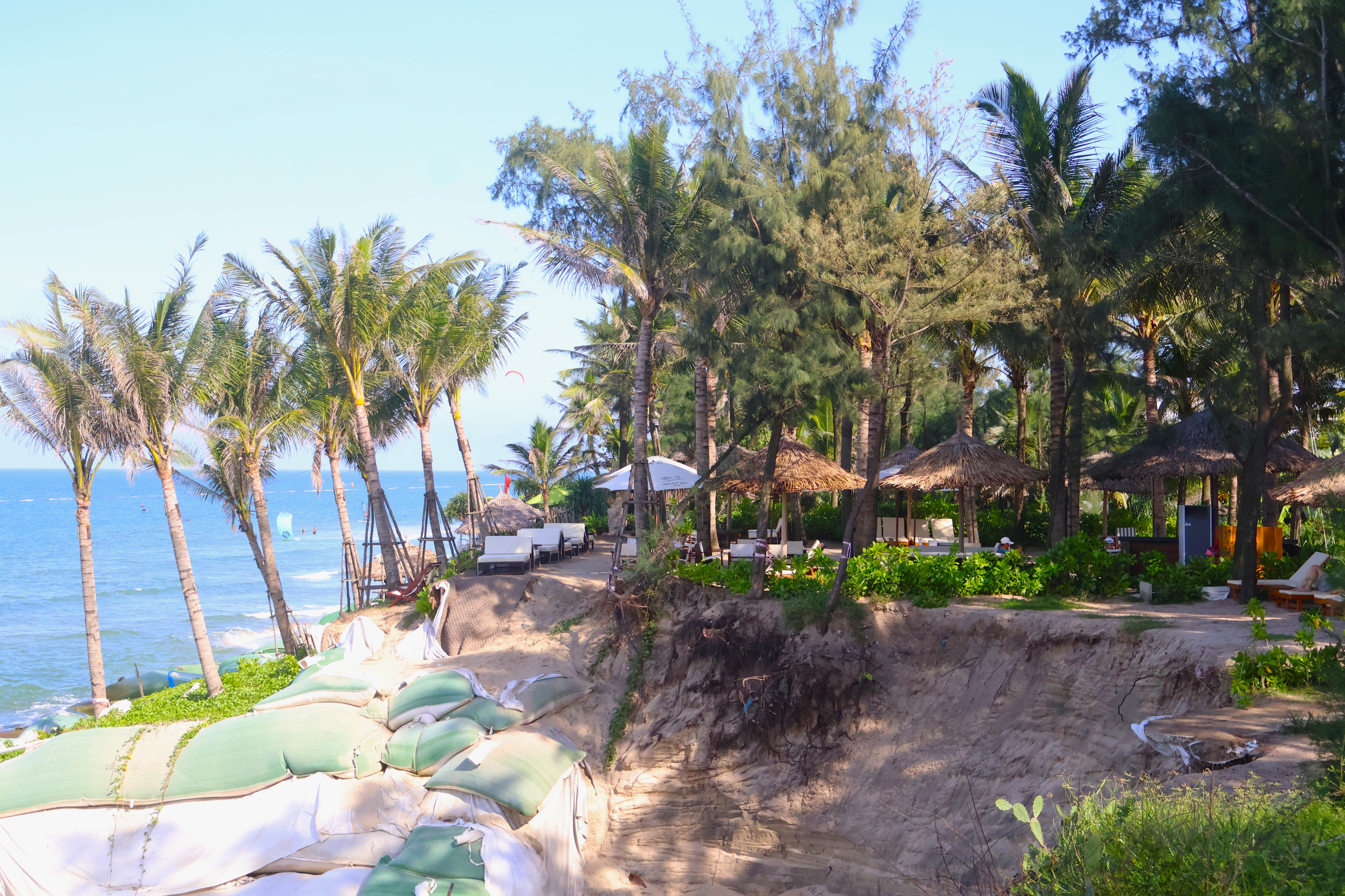 Tại khu vực bờ biển đoạn song song với tuyến đường Nguyễn Phan Vinh, các vệt sạt lở đã ăn sâu vào bên trong, tạo vách đứng, có điểm cao từ 4-5m giáp với khu vực kinh doanh của người dân.