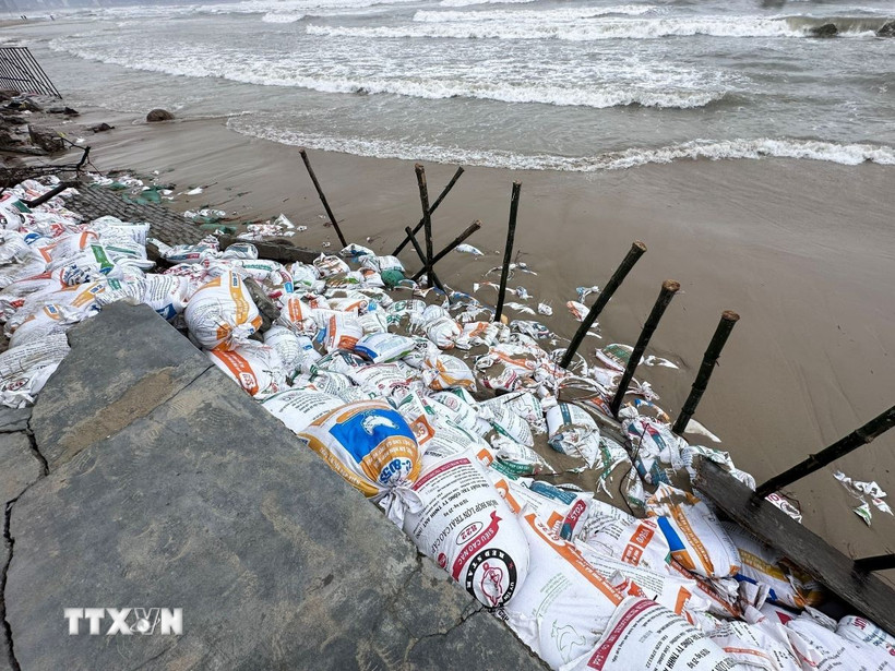 Các bao cát được chèn vào các khu vực nước biển xâm thực để hạn chế sạt lở. (Ảnh: Trần Lê Lâm/TTXVN)
