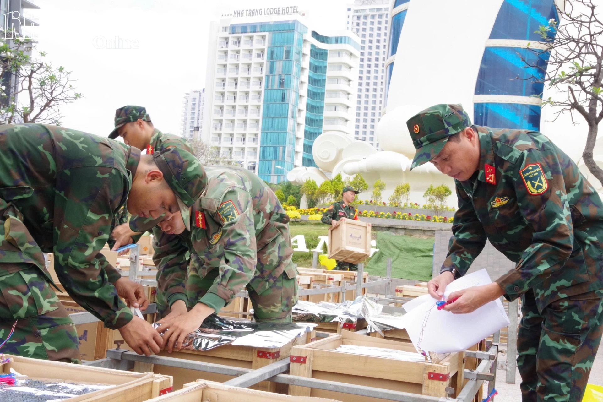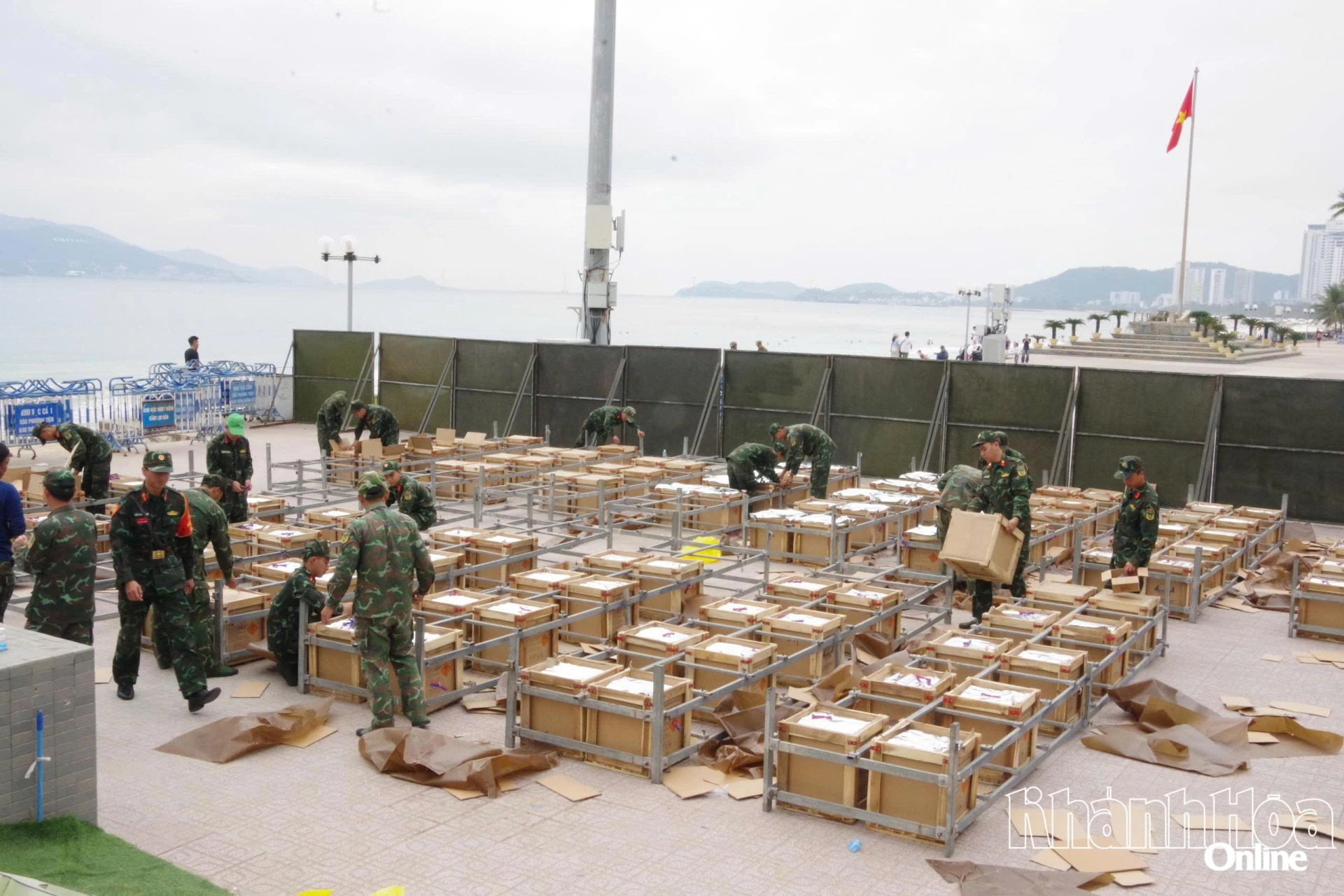Cán bộ, chiến sĩ lắp ráp, hoàn thiện trận địa pháo hoa tại Quảng trường 2 tháng 4, phường Nha Trang.