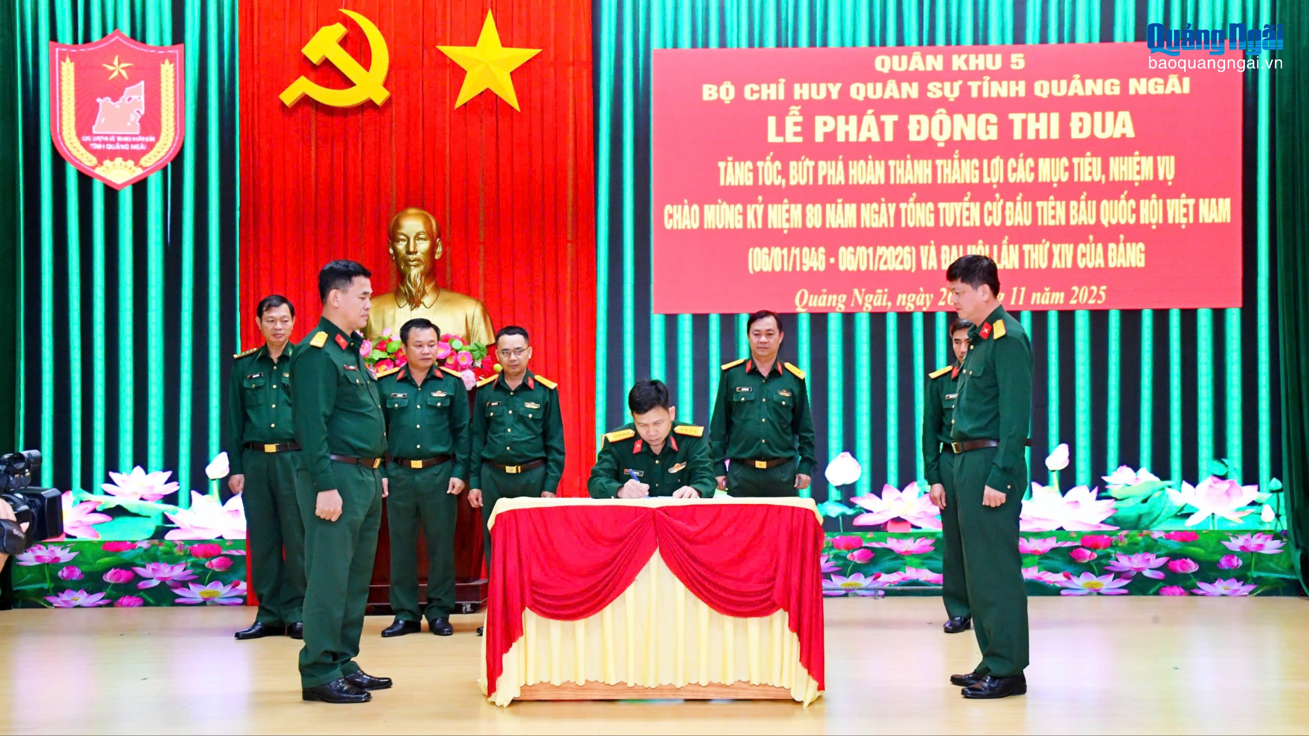 Bộ CHQS tỉnh Quảng Ngãi đã tổ chức Lễ phát động đợt thi đua “tăng tốc, bứt phá” hoàn thành thắng lợi các mục tiêu, nhiệm vụ chào mừng kỷ niệm 80 năm Ngày Tổng tuyển cử đầu tiên bầu Quốc hội Việt Nam (6/1/1946 - 6/1/2026) và Đại hội lần thứ XIV của Đảng.