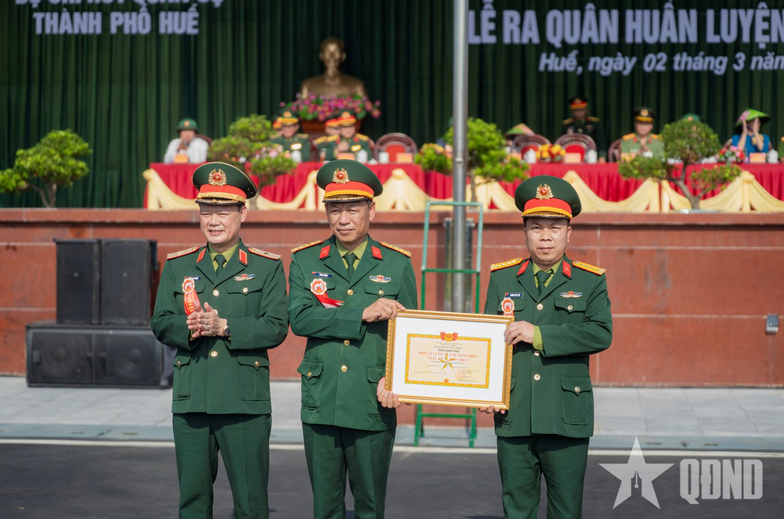 Thiếu tướng Hoàng Duy Chiến trao danh hiệu "Đơn vị vững mạnh toàn diện" tặng Bộ CHQS TP Huế.