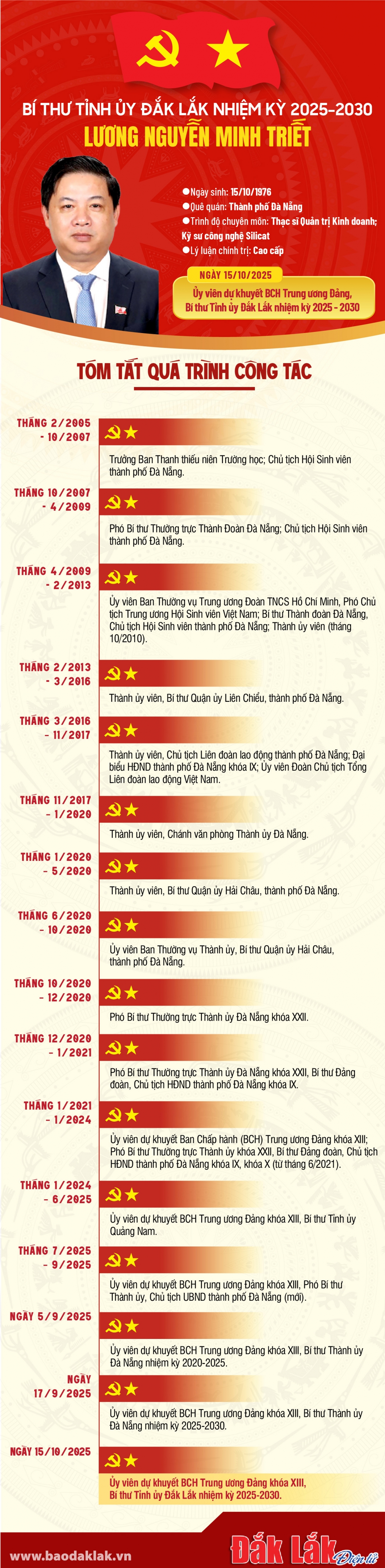 Tại hội nghị, Ban Tổ chức Trung ương đã công bố Quyết định 2448-QĐNS/TW của Bộ Chính trị về việc chỉ định nhân sự giữ chức Bí thư Tỉnh ủy Đắk Lắk nhiệm kỳ 2025 - 2030 đối với đồng chí Lương Nguyễn Minh Triết, Ủy viên Dự khuyết Trung ương Đảng, Bí thư Thành ủy Đà Nẵng, nhiệm kỳ 2020-2025 giữ chức Bí thư Tỉnh ủy Đắk Lắk nhiệm kỳ 2025 – 2030 từ ngày 15/10/2025.
