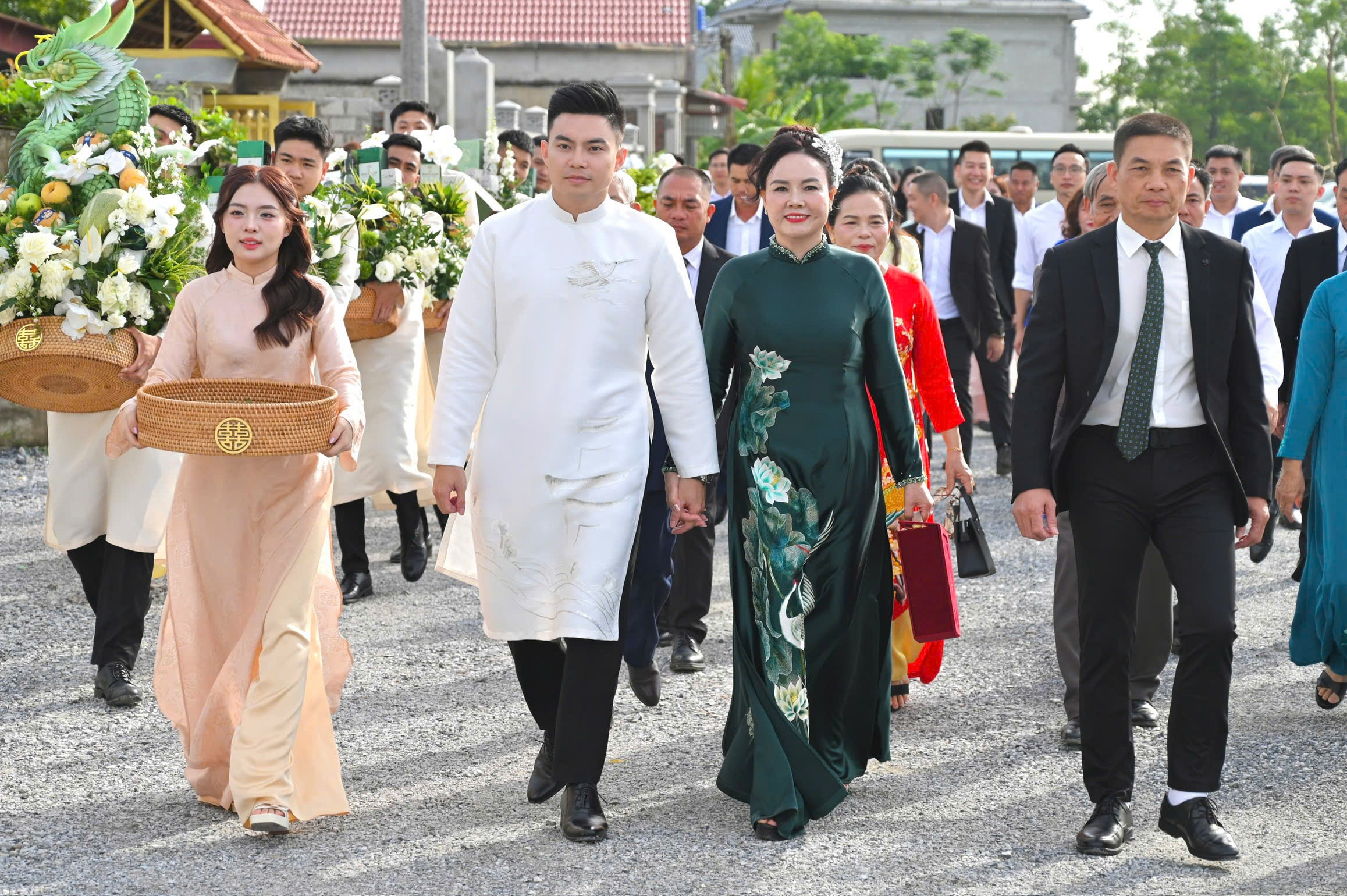 Trong buổi lễ ấm cúng, giản dị, ông Nguyễn Viết Hải, bố của chú rể của Nguyễn Viết Vương xúc động chia sẻ: “Đã nhiều tháng và nhiều năm, con trai tôi là Nguyễn Viết Vương và Đỗ Thị Hà yêu thương, tìm hiểu nhau. Giờ đây, cả hai quyết định tiến đến hôn nhân để có cuộc sống dài lâu. Với mong muốn của 2 đứa và sự đồng tình của 2 bên gia đình, hôm nay ngày lành tháng tốt, gia đình nhà trai mang theo tráp trầu cau, hoa quả... để tỏ lòng biết ơn với gia đình nhà gái và cũng sắp sửa thành con dâu tôi. Tôi rất biết ơn gia đình nhà gái đã đồng ý gả con gái cho con trai tôi. Tôi hứa nuôi dạy cháu để cháu phát triển hơn. Mong hai con sống thuận hòa, hạnh phúc bên nhau”.