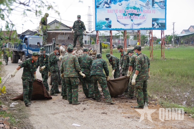 Từ ngày 22-11 đến nay, khi nước lũ rút, tại hiện trường, các lực lượng của Trung đoàn 584 (Bộ CHQS tỉnh Đắk Lắk) đang khẩn trương dọn dẹp bùn đất, thu gom rác thải tạo điều kiện cho người dân đi lại thuận lợi, từng bước khôi phục sinh hoạt và sản xuất. Do nước lũ dâng cao, lượng rác thải sinh hoạt cùng nhiều loại vật dụng khác bị cuốn trôi theo dòng chảy dạt vào các tuyến đường, gây mất vệ sinh môi trường và cản trở giao thông. Dù thời tiết còn nhiều bất lợi, nhưng cán bộ, chiến sĩ vẫn nêu cao tinh thần xung kích, làm việc liên tục từ sáng sớm, đến tối muộn, với quyết tâm hoàn thành nhiệm vụ sớm khôi phục nhịp sống ở vùng rốn lũ trở lại bình thường.