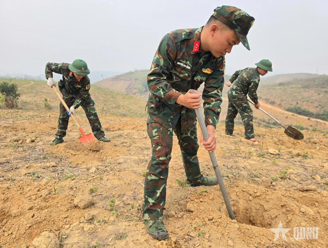 Cán bộ, chiến sĩ Bộ CHQS tỉnh đào hố trồng cây mắc ca và cà phê.
