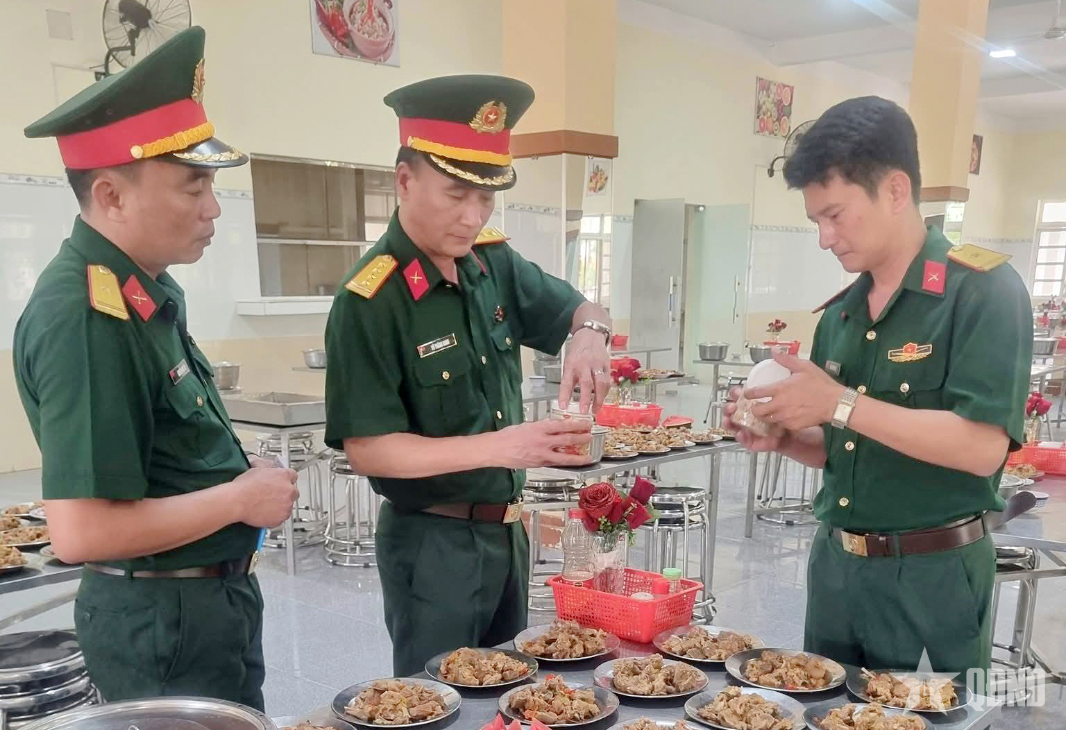 Đoàn công tác kiểm tra chất lượng bữa ăn của chiến sĩ mới.