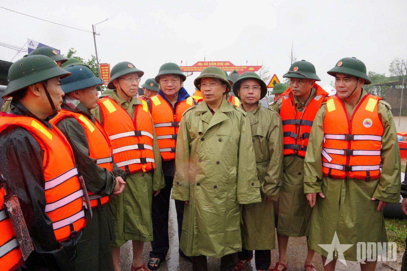 Đoàn công tác Bộ CHQS tỉnh Hà Tĩnh báo cáo tình hình với Bí thư Tỉnh ủy Hà Tĩnh Nguyễn Duy Lâm tại điểm tập kết, điều phối cứu hộ xã Cẩm Duệ.