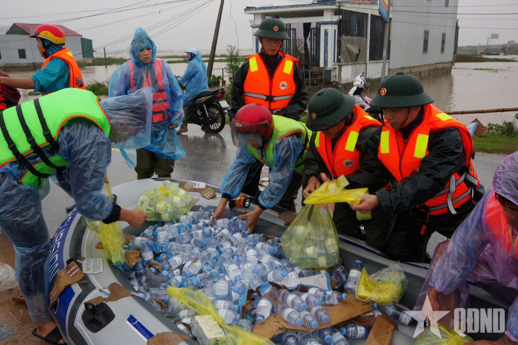 Trong ngày, Bộ CHQS tỉnh Hà Tĩnh đã huy động hơn 600 thùng mì tôm và lương khô, 300 thùng nước suối đóng chai với tổng trị giá hơn 100 triệu đồng để hỗ trợ trước mắt cho nhân dân vùng ngập lụt.