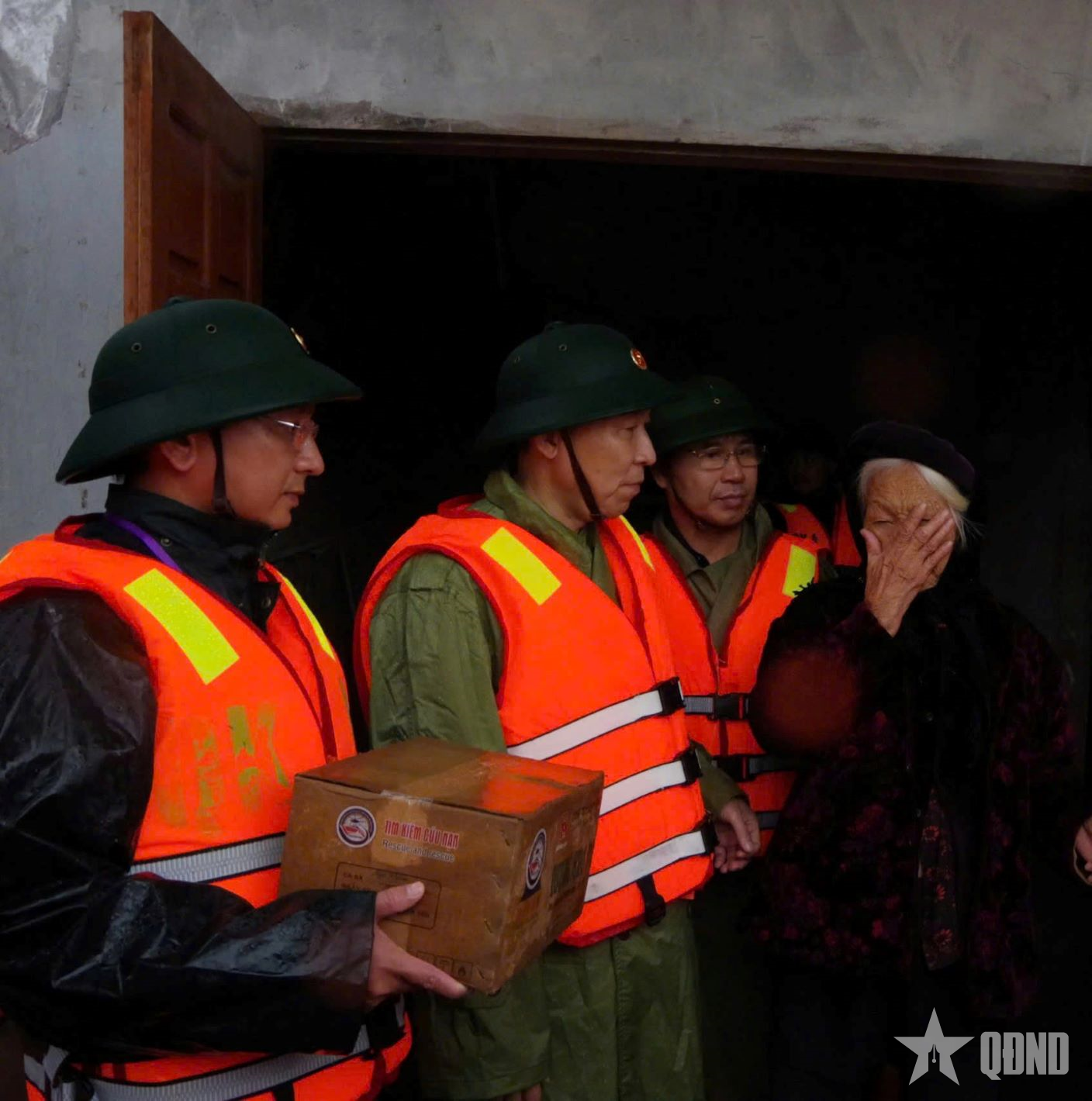 Đại tá Võ Quang Thiện, Chính ủy Bộ CHQS tỉnh Hà Tĩnh đến thăm hỏi các hộ dân trong vùng ngập lụt.