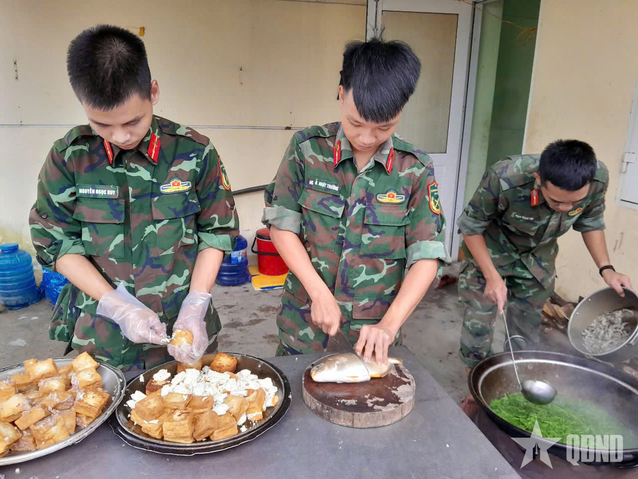 Bếp ăn dã ngoại được dựng lên đơn sơ nhưng luôn đỏ lửa từ sáng sớm. Để bảo đảm bộ đội đi làm từ 5 giờ, các “anh nuôi” phải dậy từ 3 giờ sáng, chuẩn bị thực phẩm để kịp lo từng bữa cơm trong ngày. Hạ sĩ Đoàn Thanh Trí, Trung đội Hữu tuyến điện, Đại đội Thông tin 1, Phòng Tham mưu, phụ trách bếp ăn, bộc bạch: “Mong muốn lớn nhất của tôi là nấu được những bữa cơm ngon để anh em ăn no, ăn hết tiêu chuẩn để có sức làm việc. Anh em có khỏe thì mới giúp dân xây nhà nhanh được”.
