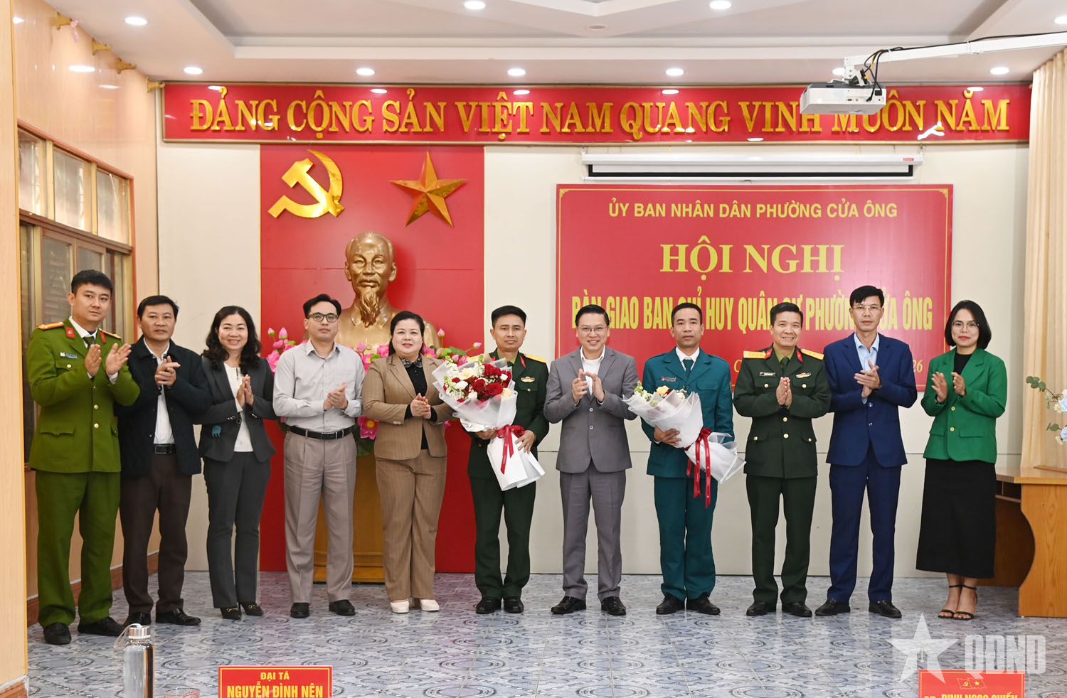 Đại tá Nguyễn Đình Nên, Chủ nhiệm Chính trị Bộ CHQS tỉnh, dự bàn giao Chỉ huy trưởng Ban CHQS phường Cửa Ông.