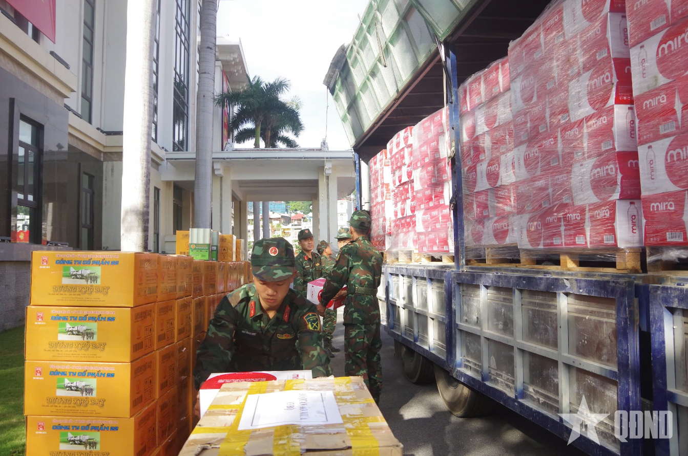 Cán bộ, chiến sĩ Bộ CHQS tỉnh Quảng Ninh cùng các lực lượng khác bốc xếp hơn 40 tấn hàng hóa tập kết tại Trụ sở Ủy ban Mặt trận Tổ quốc Việt Nam tỉnh Quảng Ninh.