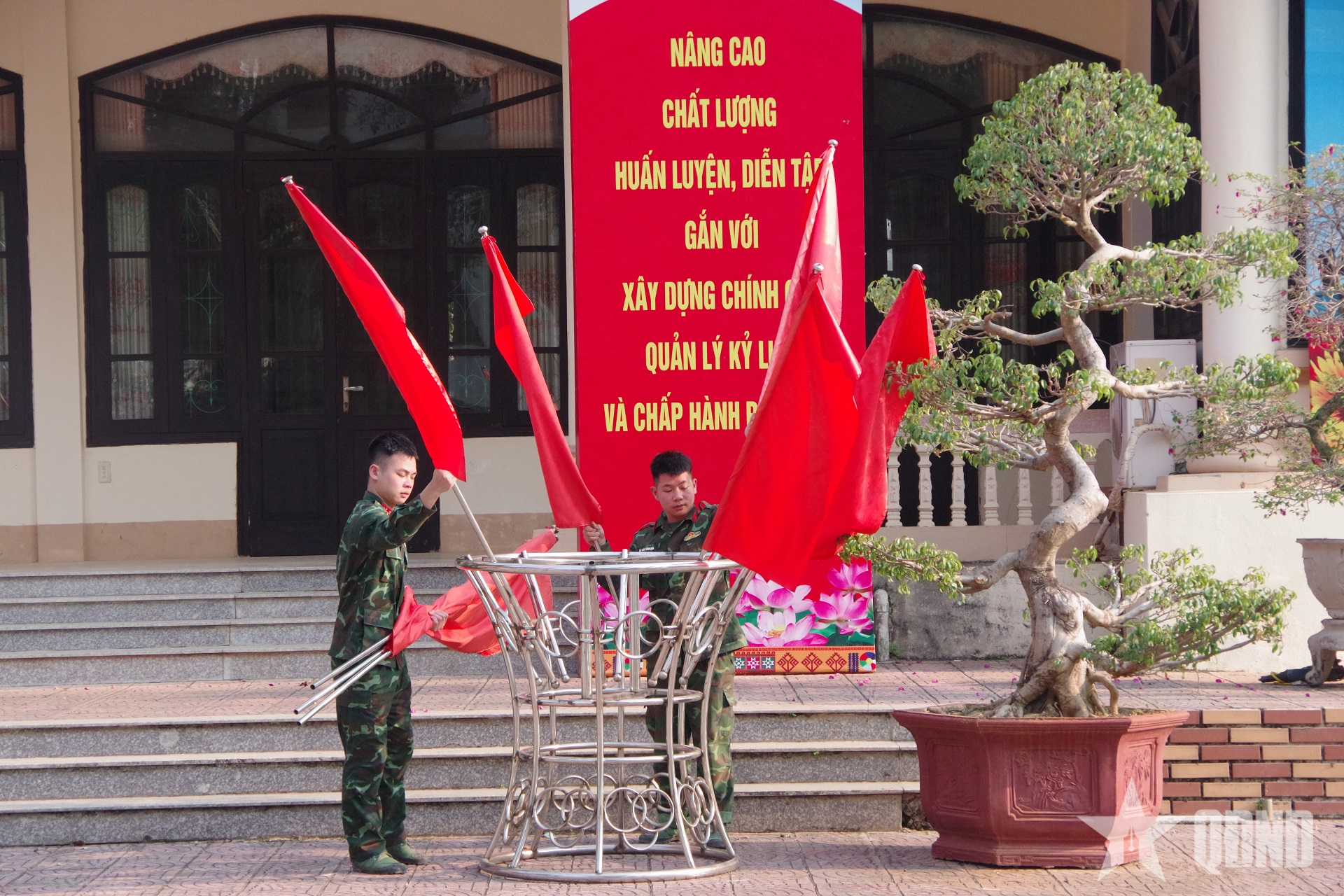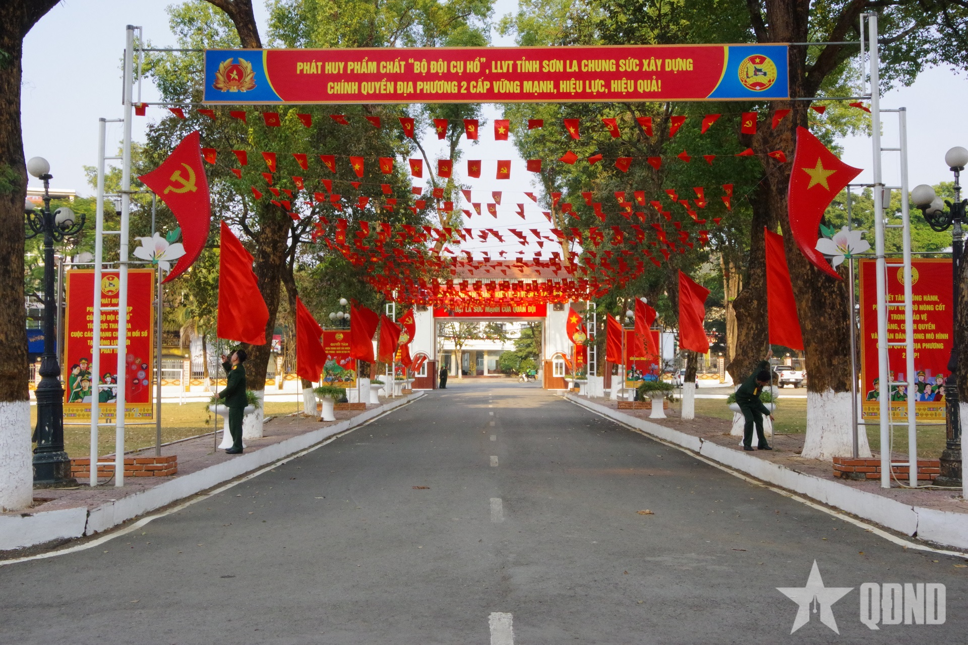 Cán bộ, chiến sĩ các cơ quan, đơn vị trang hoàng cờ hoa chào mừng Đại hội XIV của Đảng.