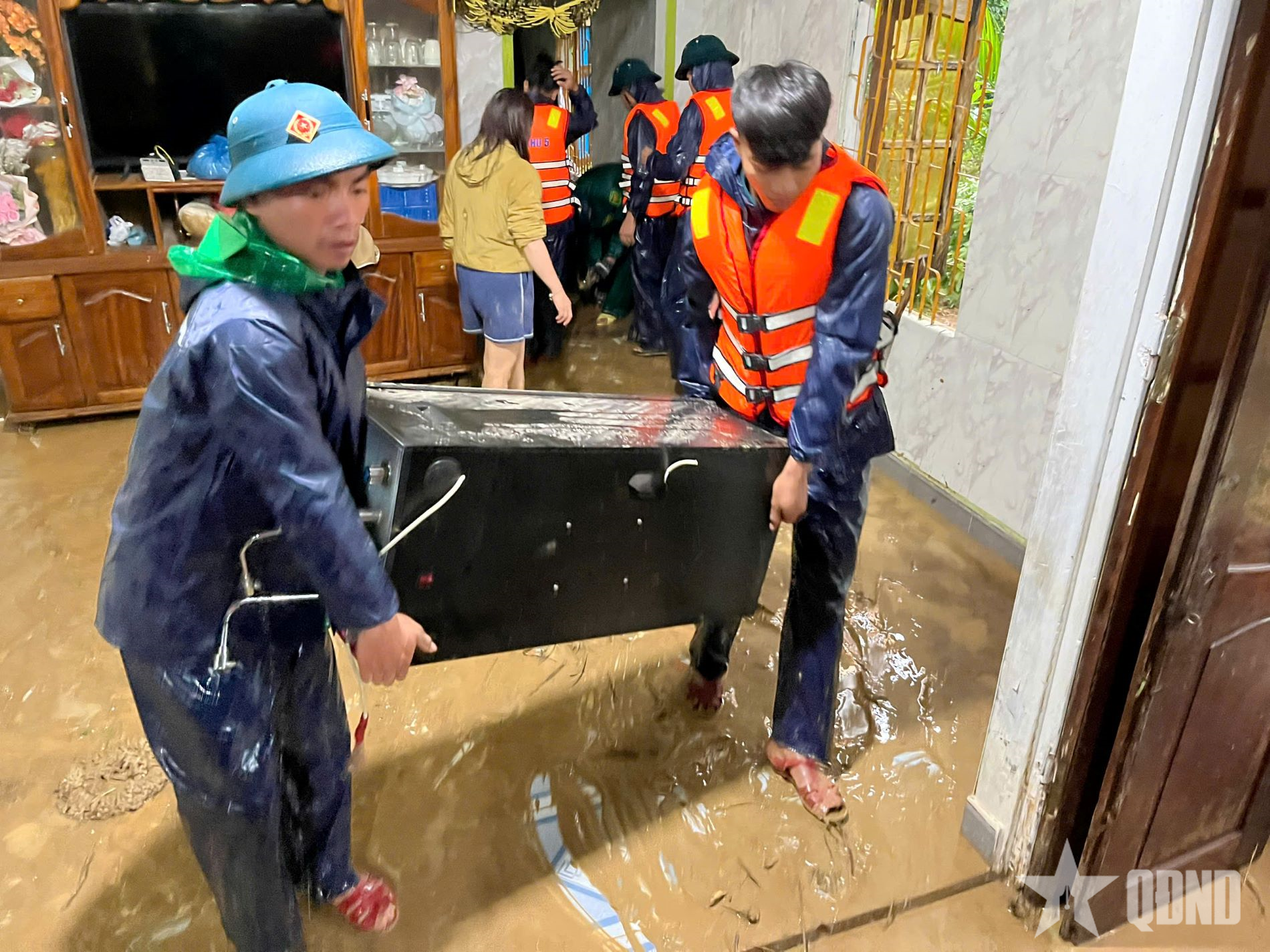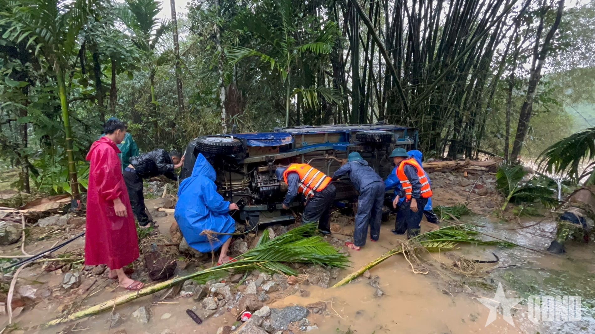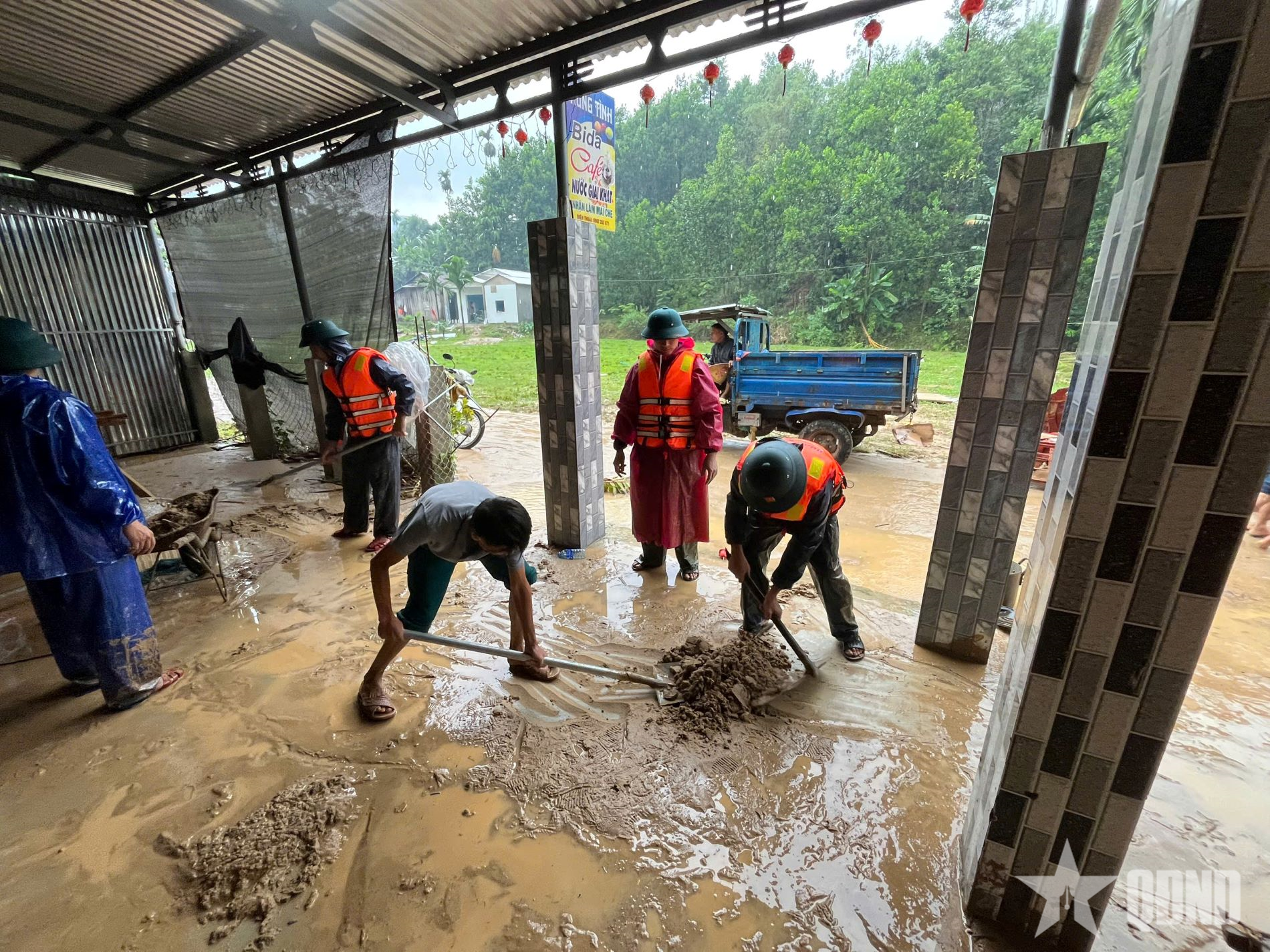Các lực lượng hỗ trợ nhân dân thôn Nước Oa (xã Trà Tân, TP Đà Nẵng) khắc phục hậu quả sau mưa, lũ.