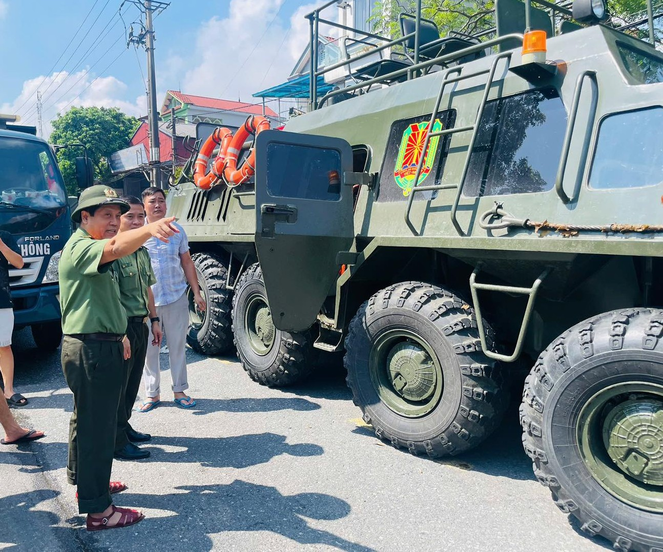 Thiếu tướng Nguyễn Hồng Nguyên, Phó chánh văn phòng Bộ Công an (đứng) cùng đoàn công tác kiểm tra, chỉ đạo công tác ứng phó, khắc phục hậu quả mưa lũ và động viên cán bộ, chiến sĩ đang làm nhiệm vụ tại các xã Trung Giã và Đa Phúc (TP Hà Nội).