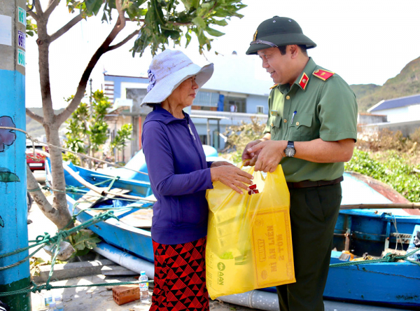 Tại phường Quy Nhơn Đông, đoàn đã thăm hỏi, tặng quà cho bà Huỳnh Thị Thoa (SN 1965) là hộ neo đơn sống một mình. Trong cơn bão vừa qua, nhà bà Thoa bị hư hỏng nặng, tường sập, mái bị tốc hoàn toàn, hiện cuộc sống lâm vào cảnh hết sức khó khăn. Được thăm hỏi, tặng quà, bà Thoa xúc động cho biết: “Nhà tôi mất gần hết, cả đêm không ngủ được. Tôi cảm ơn đoàn công tác nhiều lắm. Được sự quan tâm, động viên kịp thời của Bộ Công an, người dân ở đây cũng cảm thấy được an ủi phần nào”.