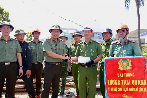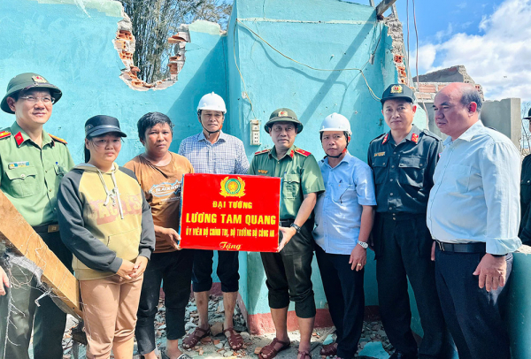 Đoàn công tác của Bộ Công an trao quà động viên của Đại tướng Lương Tam Quang cho gia đình ông Nguyễn Văn Phụng tại xã Tuy Phước Đông thiệt hại nặng sau bão.
