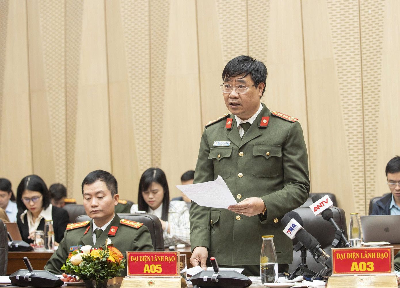 Đại tá Nguyễn Hồng Quân, Phó Cục trưởng Cục An ninh mạng và phòng, chống tội phạm sử dụng công nghệ cao (A05, Bộ Công an) trả lời tại cuộc họp báo. Ảnh: Phạm Nam.