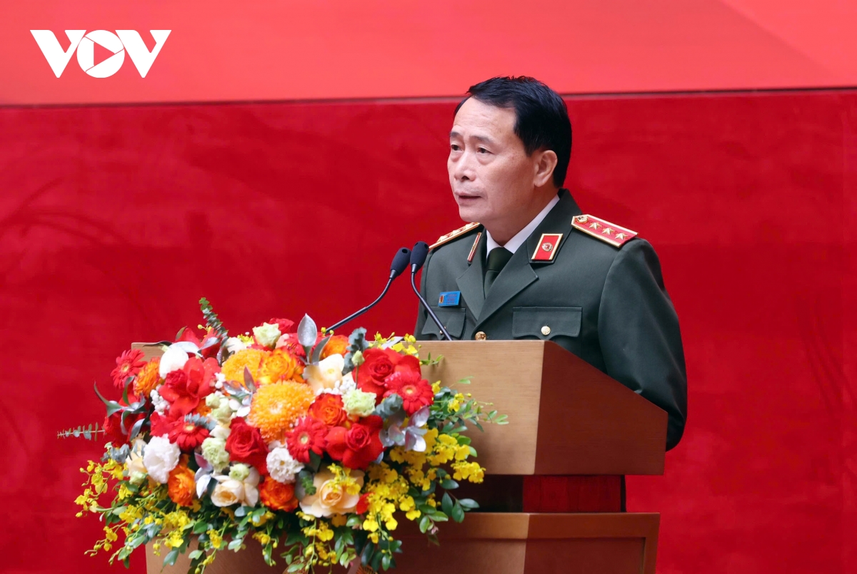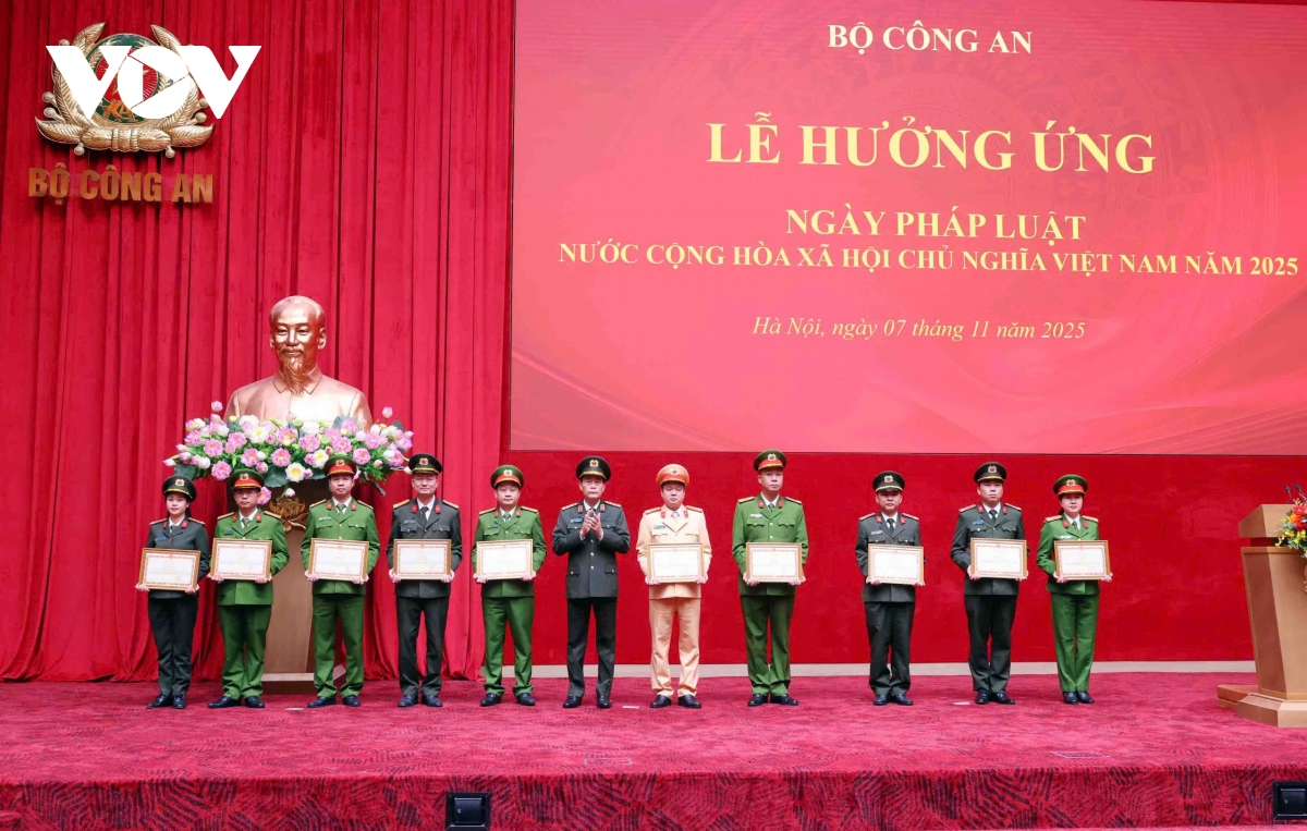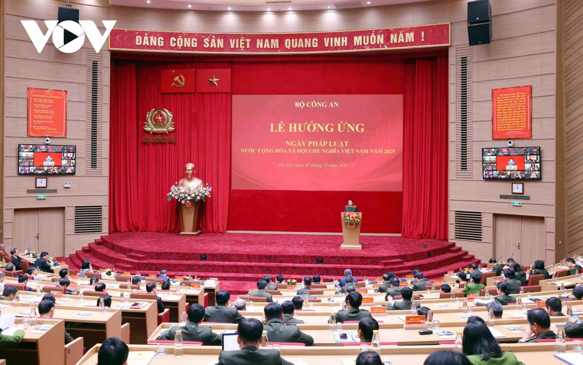 Sáng 7/11, Bộ Công an tổ chức Lễ hưởng ứng Ngày Pháp luật nước Cộng hòa xã hội chủ nghĩa Việt Nam năm 2025; Tổng kết 5 năm thực hiện Kết luận số 80 của Ban Bí thư về tiếp tục thực hiện Chỉ thị số 32 của Ban Bí thư về tăng cường sự lãnh đạo của Đảng trong công tác phổ biến, giáo dục pháp luật, nâng cao ý thức chấp hành của cán bộ, nhân dân và Tổng kết cuộc thi viết "Tìm hiểu Luật Dữ liệu trong Công an nhân dân". (Ảnh: Phú Kiên)