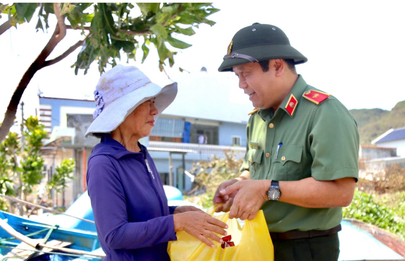 Tại phường Quy Nhơn Đông, Đoàn đã đến thăm hỏi, trao quà cho bà Huỳnh Thị Thoa (SN 1965), một hộ neo đơn có hoàn cảnh đặc biệt khó khăn. Trong đợt bão vừa qua, ngôi nhà của bà Thoa bị hư hỏng nặng, tường sập và mái bị tốc hoàn toàn. Xúc động khi được lực lượng Công an đến tận nơi động viên, bà Thoa chia sẻ: “Nhà tôi mất gần hết, cả đêm không ngủ được. Tôi cảm ơn Bộ Công an rất nhiều. Sự quan tâm và giúp đỡ kịp thời này khiến người dân chúng tôi cảm thấy được an ủi, ấm lòng hơn giữa hoạn nạn”.