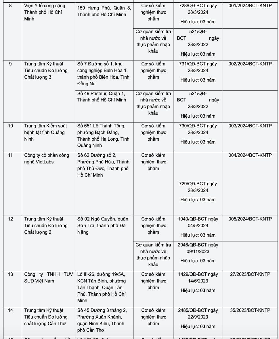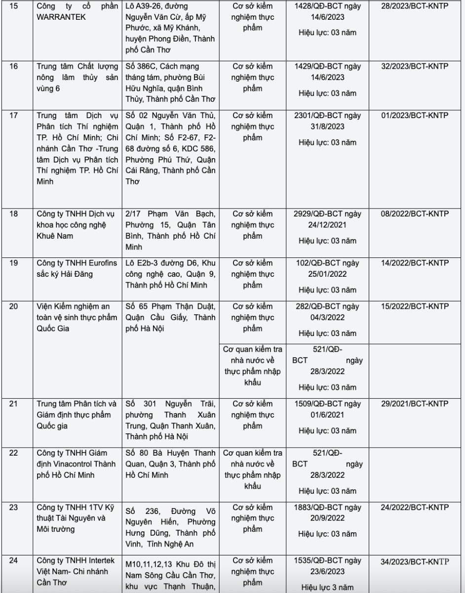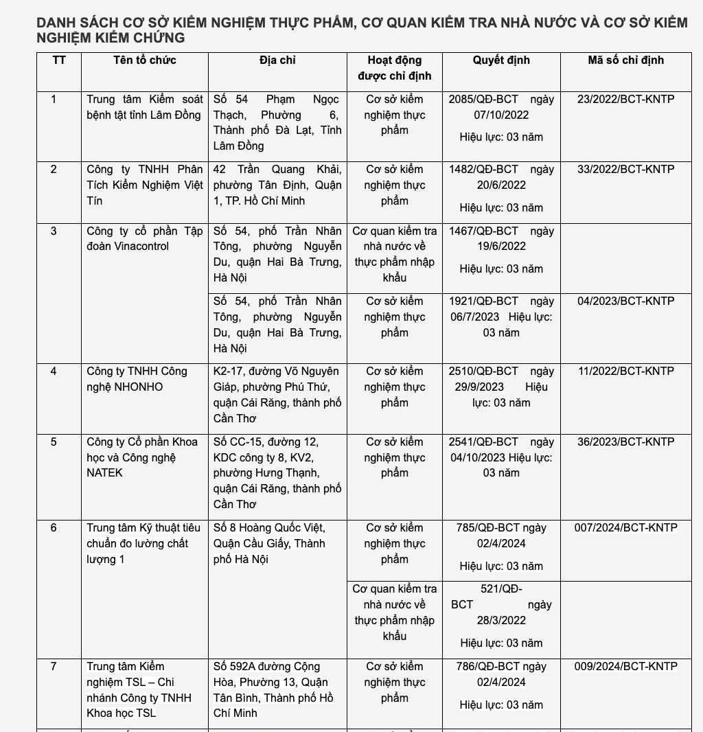 Danh sách các cơ quan kiểm tra nhà nước về an toàn thực phẩm đối với thực phẩm nhập khẩu thuộc trách nhiệm quản lý của Bộ Công Thương được công bố tại Phụ lục 1 kèm theo công văn; danh sách các cơ sở kiểm nghiệm thực phẩm phục vụ quản lý nhà nước về an toàn thực phẩm do Bộ Công Thương chỉ định được công khai trên Cổng thông tin điện tử của Bộ.