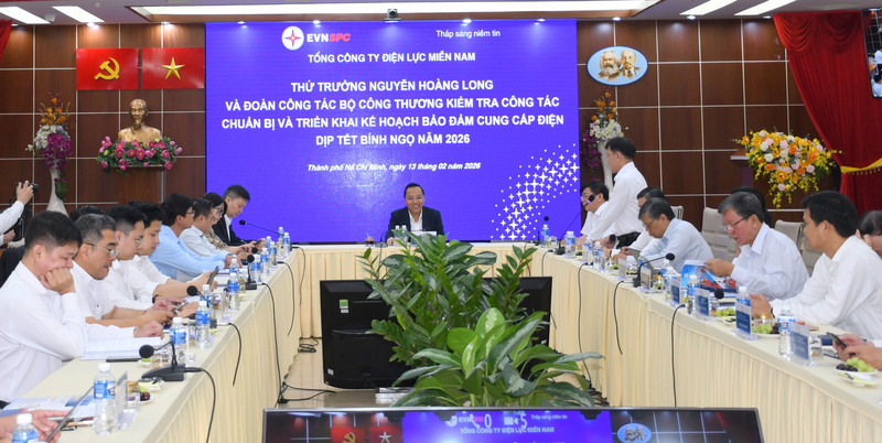 Ngày 13/2/2026, Đoàn công tác Bộ Công Thương do Thứ trưởng Nguyễn Hoàng Long làm Trưởng đoàn đã có buổi làm việc với Tổng công ty Điện lực miền Nam (EVNSPC) về công tác chuẩn bị và triển khai kế hoạch đảm bảo điện dịp Tết Nguyên đán Bính Ngọ 2026.