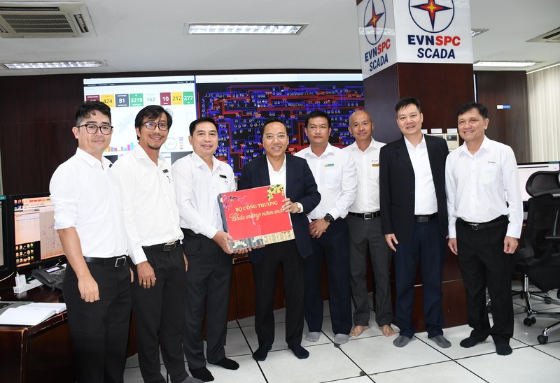 Thứ trưởng Nguyễn Hoàng Long kiểm tra thực tế tại Trung tâm điều hành SCADA của Tổng công ty Điện lực miền Nam; tặng quà chúc Tết của Bộ Công Thương cho các kỹ sư trực vận hành hệ thống. Ảnh: Thanh Minh.