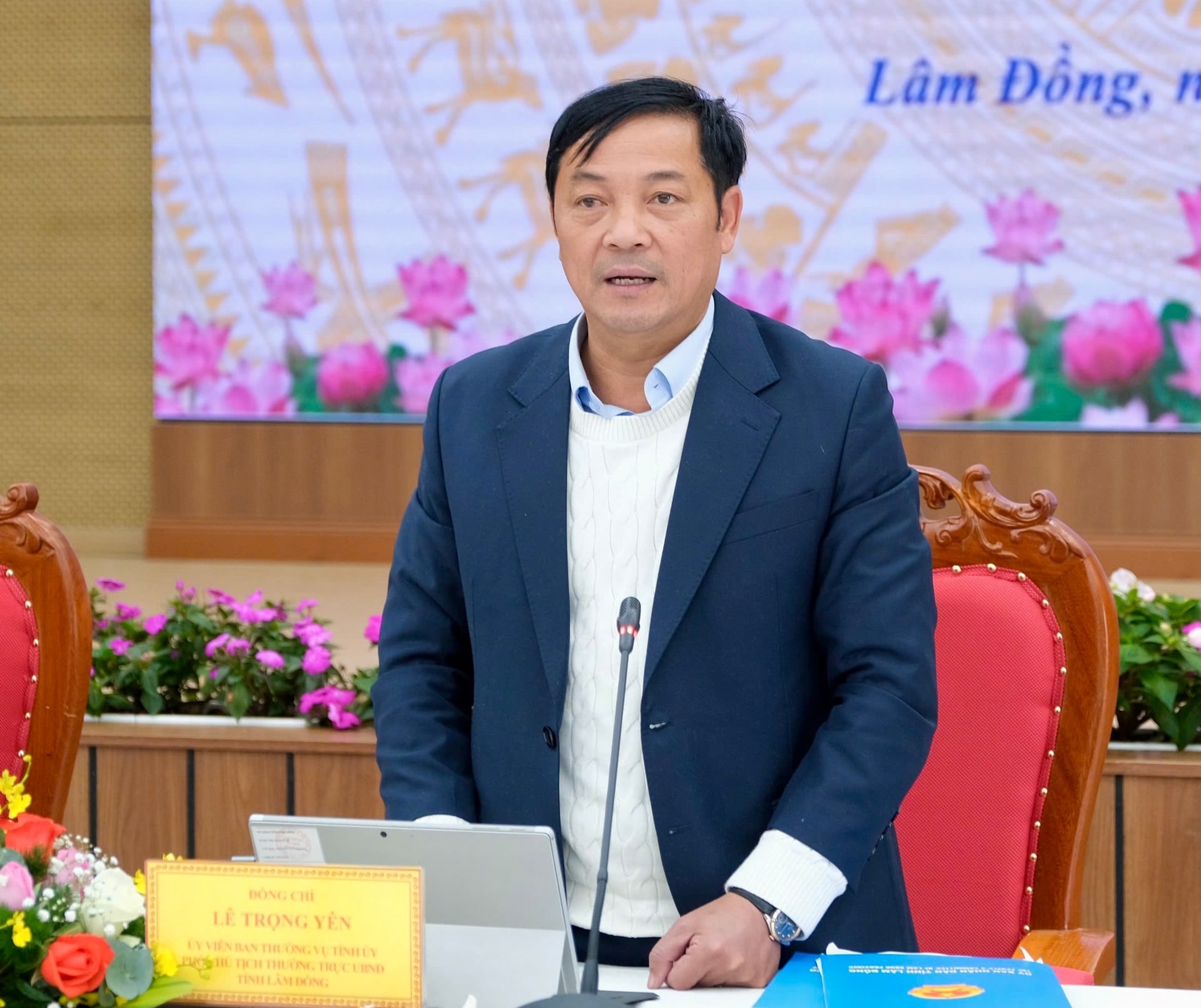 Ủy viên Ban Thường vụ Tỉnh ủy, Phó Chủ tịch Thường trực UBND tỉnh Lâm Đồng Lê Trọng Yên cùng lãnh đạo các sở, ngành liên quan tham dự buổi làm việc.