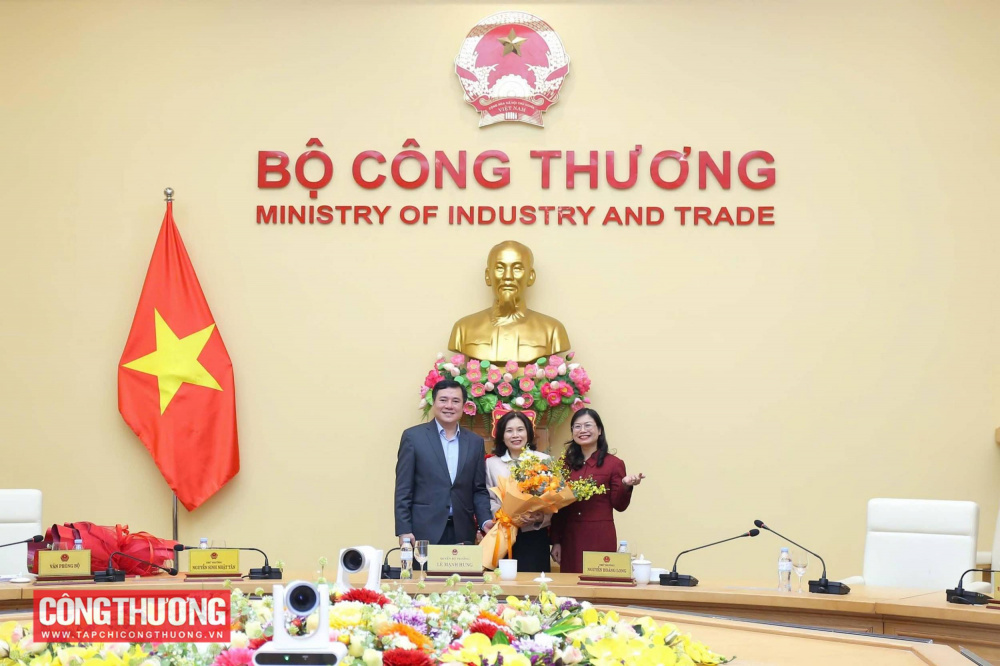 Quyền Bộ trưởng Bộ Công Thương Lê Mạnh Hùng và Thứ trưởng Bộ Công Thương Nguyễn Sinh Nhật Tân chúc mừng tân Tổng Biên tập Tạp chí Công Thương