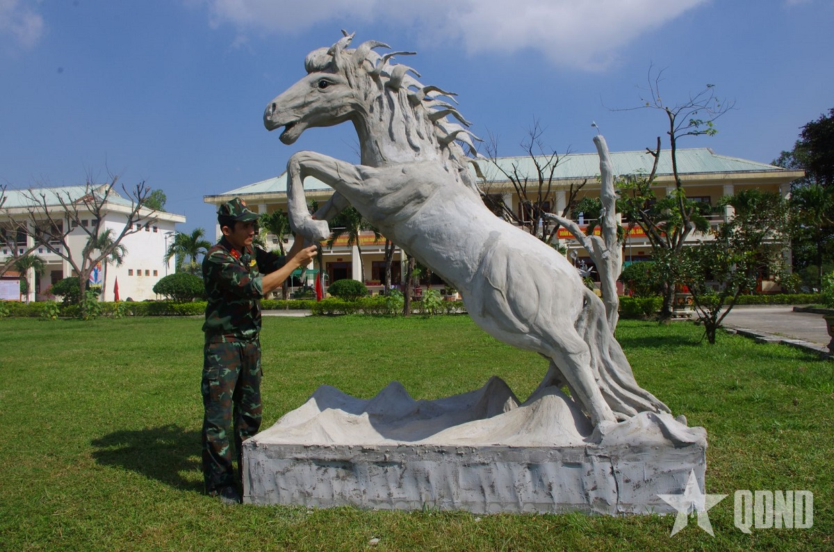Tranh thủ trời nắng ráo, Đại úy QNCN Nguyễn Ngọc Việt, Chiến đấu viên Đại đội Chống khủng bố cùng các “nghệ nhân” trong tổ đắp linh vật của Tiểu đoàn Đặc công 409 cố gắng đẩy nhanh tiến độ thi công, để 4 chú “ngựa trời” kịp trình làng, ra mắt trước đêm giao lưu "Vòng tay đồng đội", chia tay các chiến sĩ hoàn thành nghĩa vụ quân sự, sắp trở về địa phương. Bên chú ngựa làm bằng bê tông, cốt thép, tư thế oai phong đang cưỡi mây, đạp gió bay về trời, Đại úy QNCN Nguyễn Ngọc Việt cho biết: “Từ những vật liệu tự nhiên, sẵn có, mỗi khi Tết đến, xuân về, Tiểu đoàn và các đại đội đều nghiên cứu, chế tác 4-6 linh vật để trang trí, làm đẹp cảnh quan, tạo điểm "check in", chụp ảnh cho bộ đội và thân nhân khi đến thăm đơn vị. Lấy ý tưởng từ truyền thuyết Thánh Gióng cưỡi ngựa về trời sau khi đánh đuổi giặc ngoại xâm, năm nay, những chú ngựa do chúng tôi chế tác đều có khả năng phun lửa, chớp mắt, phát ra tiếng hí nên rất sống động. Sau Tết Nguyên đán, linh vật sẽ được chuyển ra khu vườn tượng “làm bạn” cùng 12 con giáp, góp phần làm đẹp cảnh quan, doanh trại”.