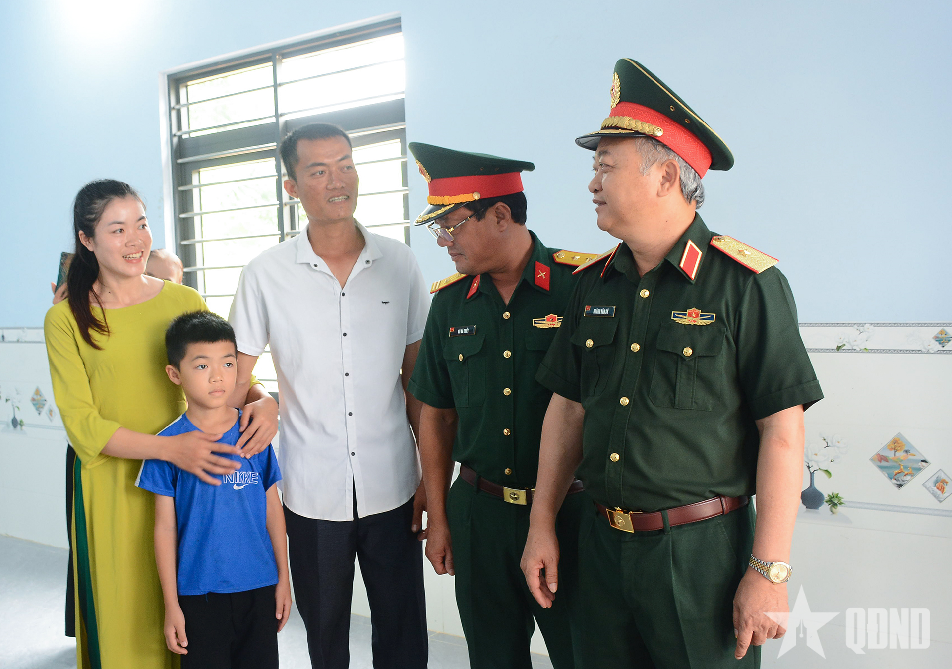 Thiếu tướng Hoàng Văn Sỹ, Tư lệnh Binh đoàn 15 và Trung tá Vũ Bá Thiết, Đoàn trưởng Đoàn Kinh tế - Quốc phòng 710 trò chuyện, động viên gia đình được đơn vị hỗ trợ xóa nhà tạm năm 2025.