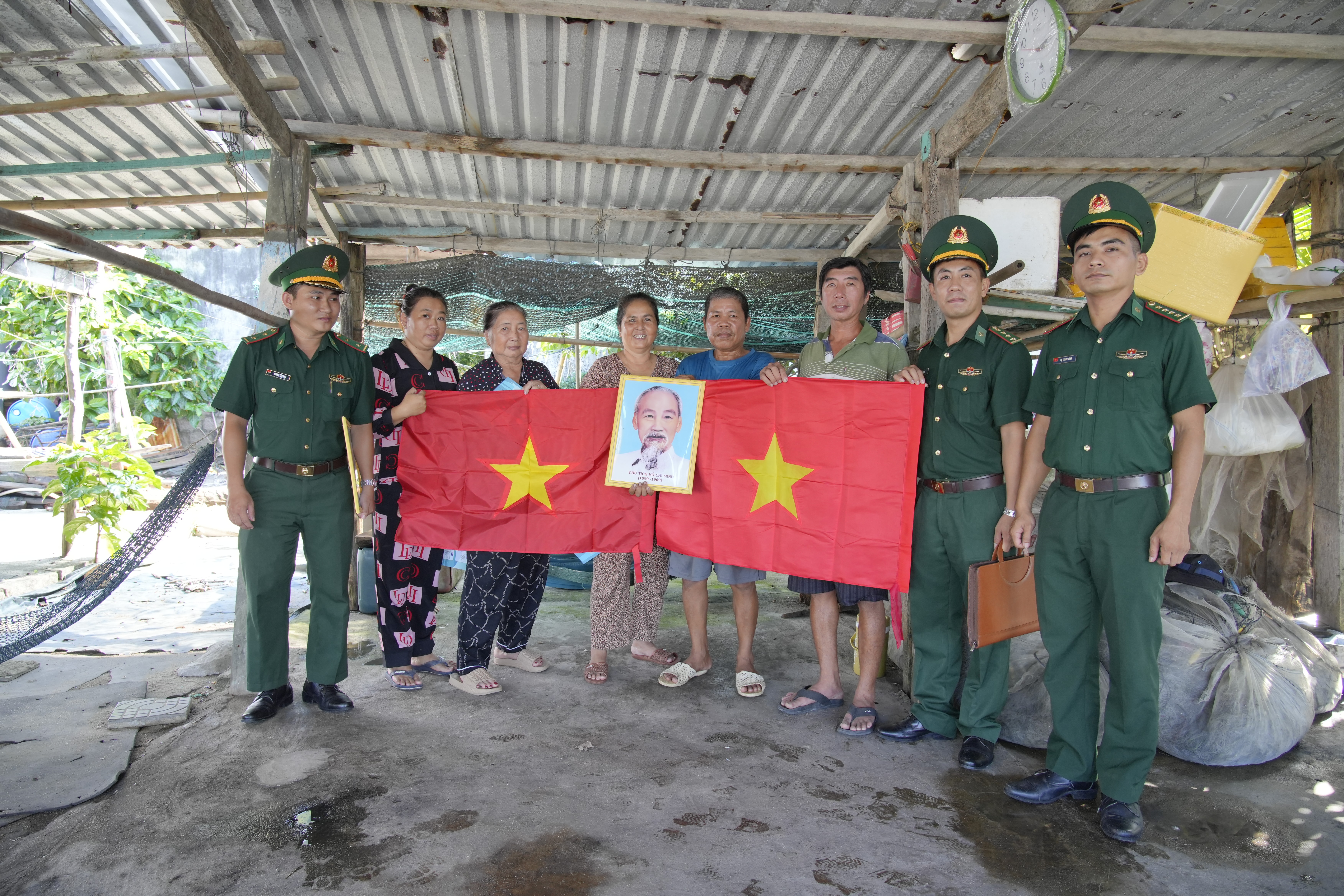 Bộ đội BIên phòng An Giang tặng ảnh Bác, cờ nước cho bà con ngư dân ra khơi bám biển. (Ảnh: Tiến Vinh)