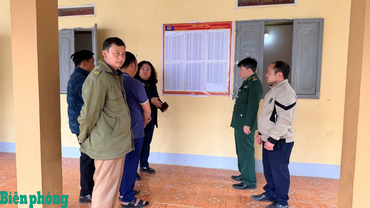 Cán bộ Đồn Biên phòng Dào San, Bộ đội Biên phòng tỉnh Lai Châu cùng lãnh đạo chính quyền địa phương kiểm tra bảng niêm yết danh sách bầu cử đại biểu Quốc hội và đại biểu Hội đồng Nhân dân các cấp. Ảnh: Đức Duẩn
