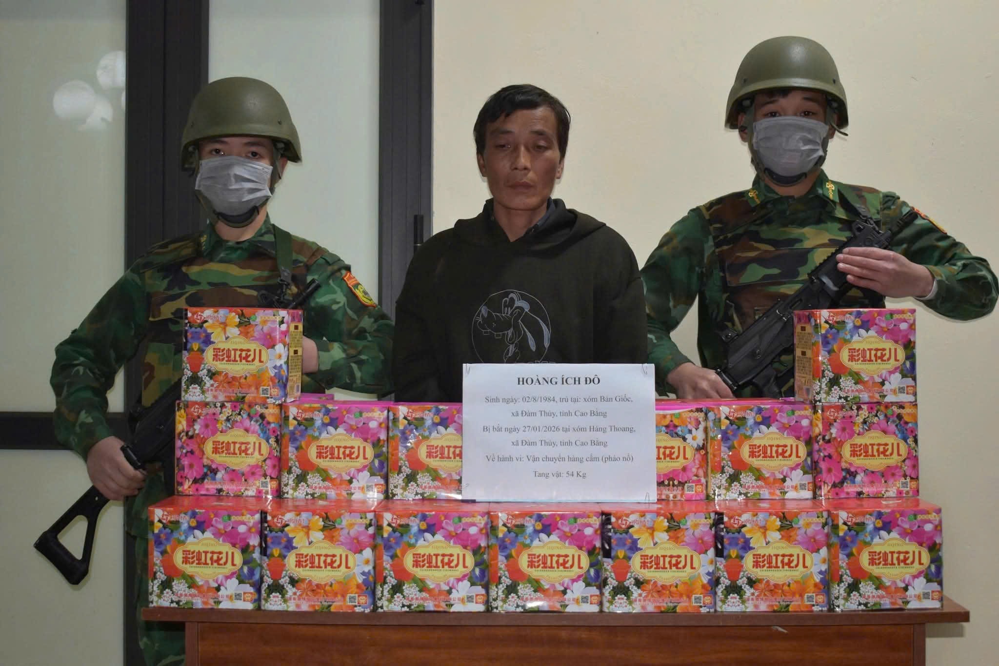 Cụ thể vào lúc 23 giờ 40 phút ngày 26/01/2026 tại xóm Háng Thoang, xã Đàm Thủy, tỉnh Cao Bằng. Đồn Biên phòng Đàm Thủy phối hợp với Phòng Nghiệp vụ, Ban Chỉ huy Bộ đội Biên phòng tỉnh thực hiện nhiệm vụ tuần tra, kiểm soát đã phát hiện, bắt quả tang đối tượng Hoàng Ích Đô, (sinh năm 1984 trú tại xóm Bản Giốc, xã Đàm Thủy, tỉnh Cao Bằng) đang có hành vi vận chuyển hàng cấm từ Trung Quốc về Việt Nam. Tang vật thu giữ tại hiện trường gồm 03 bao tải, bên trong có chứa các hình khối hộp, in chữ nước ngoài, tổng trọng lượng 54kg.